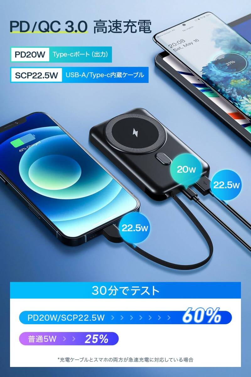 • 【PD20W/22.5W急速充電・PD/QC3.0対応】 PD/QC3.0対応し、圧倒的な充電スピードを持ち、PD対応機種でしたらわずか30分で0%から60%に充電可能な急速充電器です。短時間で携帯電話の電力を回復させることができます。小体積で出張や旅行などの短期外出だけでなく、緊急事態時に非常用電源としても持ち運びに便利です。