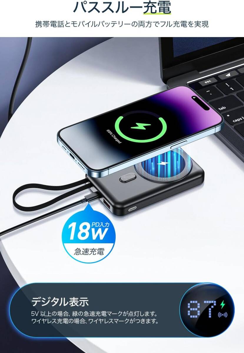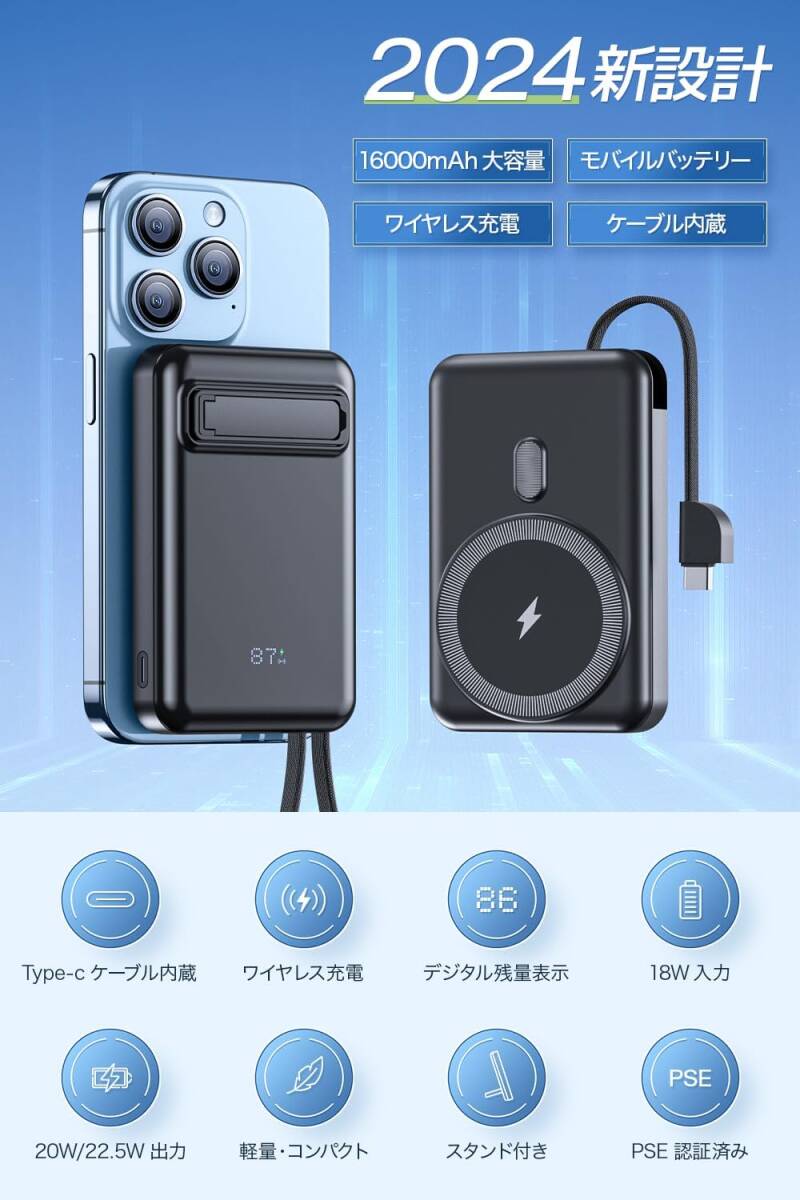 【ワイヤレス充電PD20W/22.5W対応】 モバイルバッテリー 大容量 16000mAh 急速充電 タイプcケーブル内蔵 軽量 小型 バッテリー マッグネット式 携帯充電器 PD/QC3.0対応 4台同時充電可能 LED残量数字表示 スマホ充電器 iPad/iPhone/Androidに適合する USB-Aポート Type-C入出力ポート コンパクト 持ち運び便利 機内持込可 PSE認証済