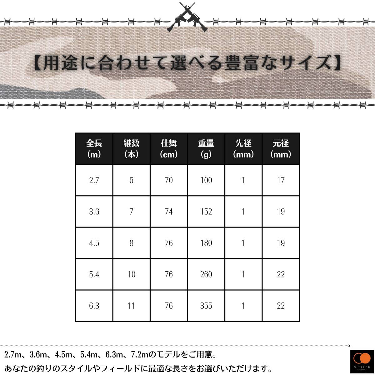 • 【用途に合わせて選べる豊富なサイズ】2.7m、3.6m、4.5m、5.4m、6.3m、7.2mのモデルをご用意。あなたの釣りのスタイルやフィールドに最適な長さをお選びいただけます。※こちらは2.7mになります。他の長さをお買い求めの場合は各長さごとの商品ページより購入お願いします。