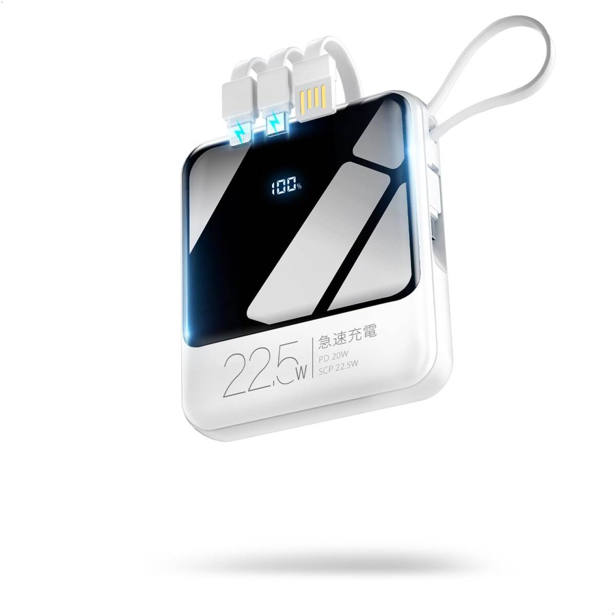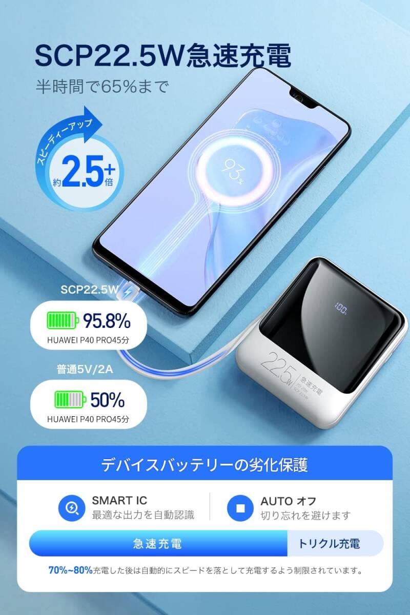 モバイルバッテリー 22800mAh 大容量 22.5W/20W急速充電 4本ケーブル内蔵 小型 バッテリー PD3.0 Type-C入出力 5台同時充電 210g超軽量