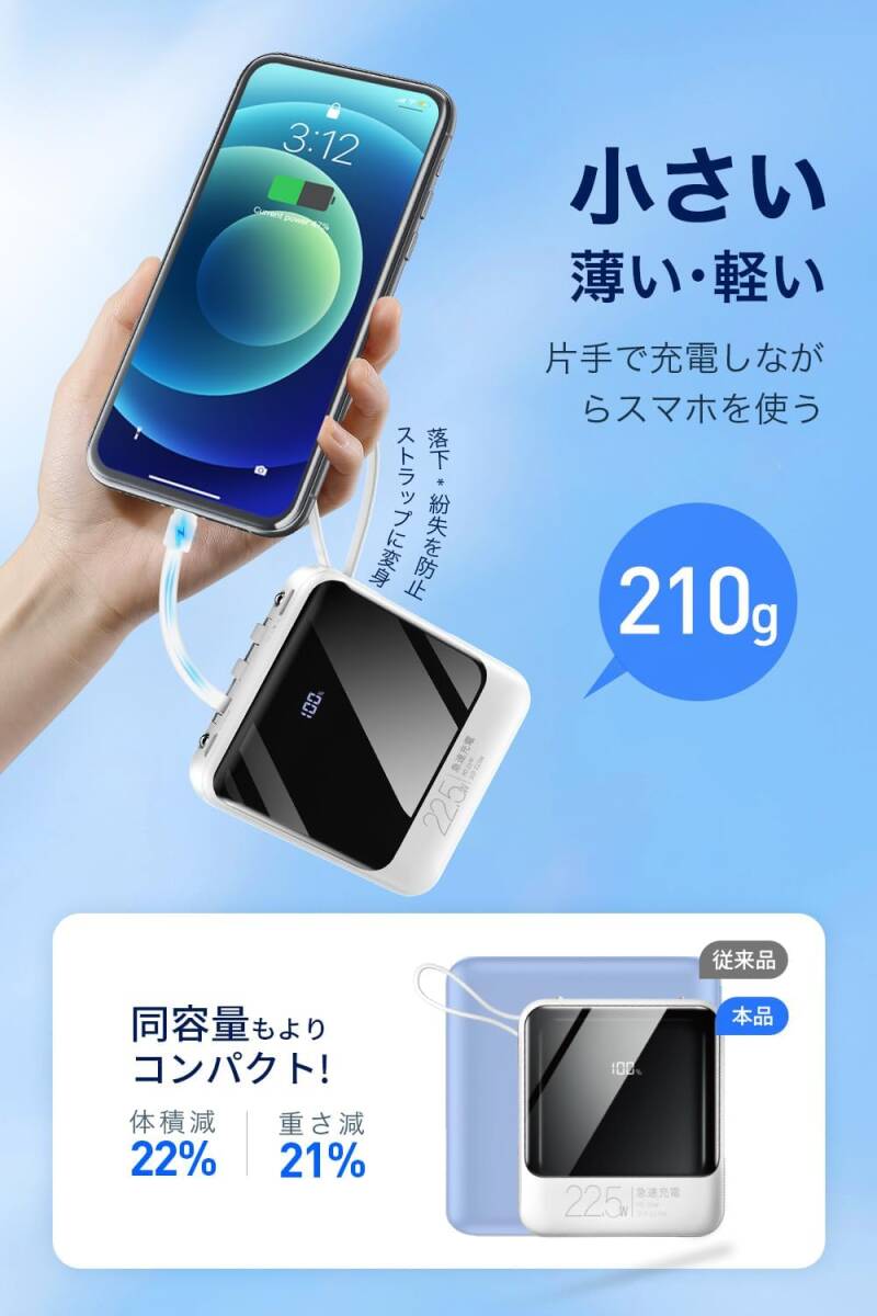 • 【小型・大容量携帯充電器】22800mAh大容量バッテリーを内蔵し、スマホへ複数回も充電できます。ポケットに収まるコンパクトサイズで、わずか210gの超軽量タイプ、片手で充電しながらスマホ使用しても負担にならない、携帯用に最適な小型モバイルバッテリーです。内蔵ケーブルがストラップに変身され、持ち運びに超便利、外出、出張、旅行から、停電、台風、地震など非常時まで大活躍します。