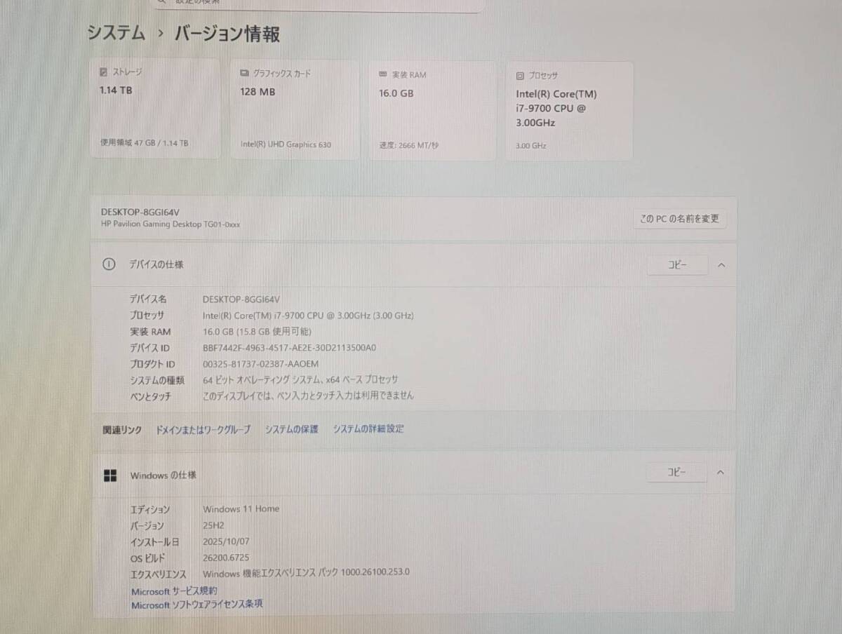 【製品名(型番)】 Pavilion Desktop TG01-0720jp