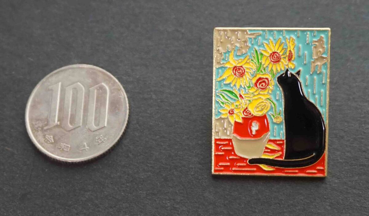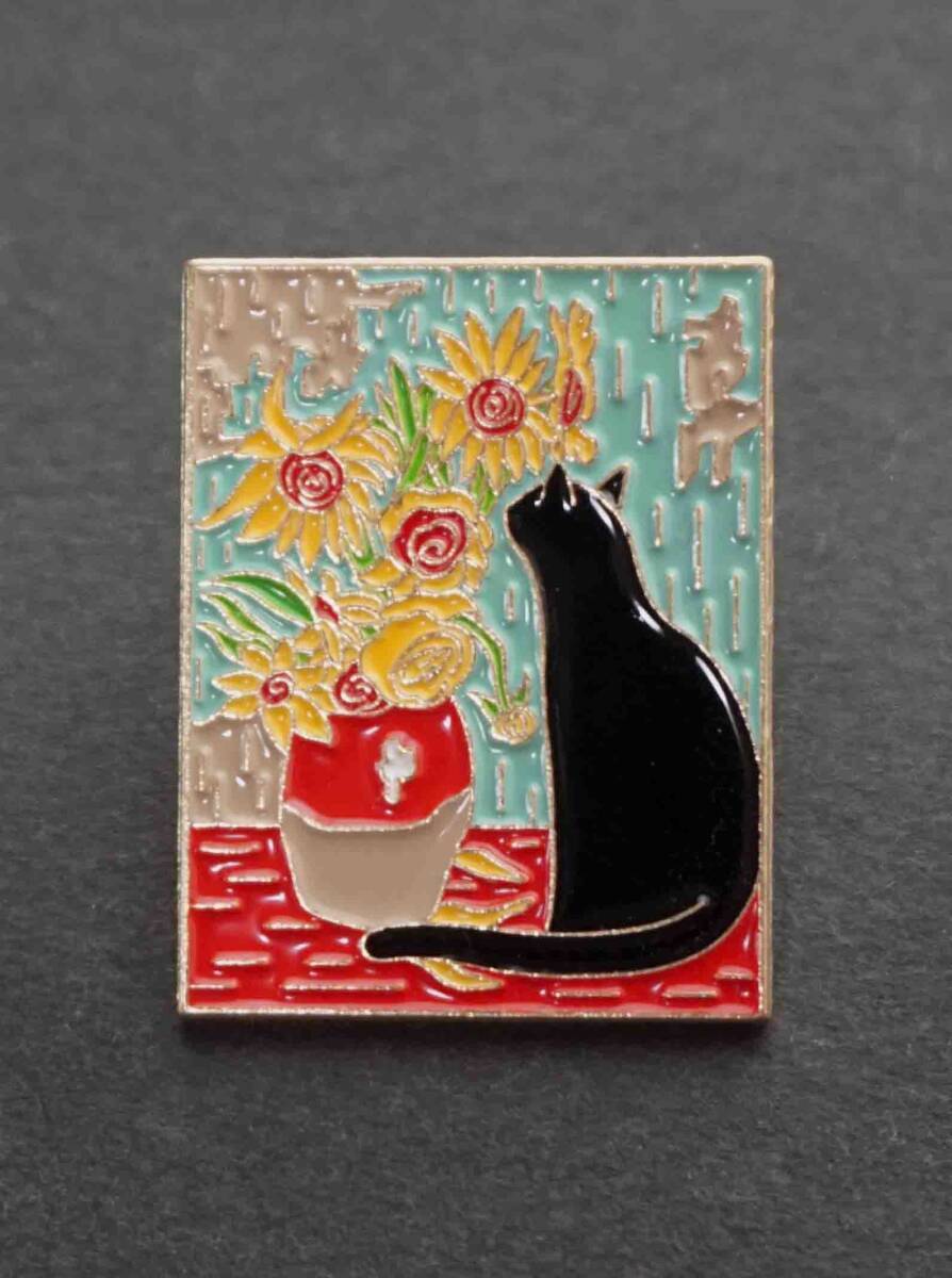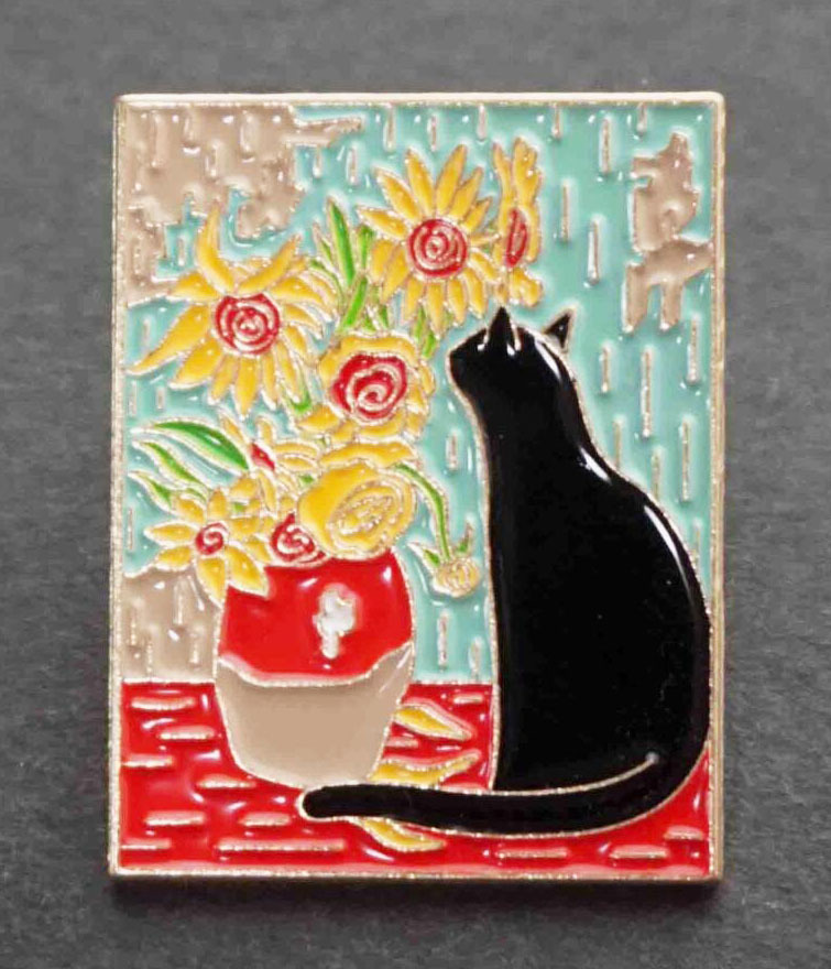 《ひまわり絵画風FR黒猫》■『ネコxひまわり 』 ■ ねこ好き (=^・^=)BLACK CAT キャット■金属ピンバッジ バッチ■おしゃれ ラッキー開運