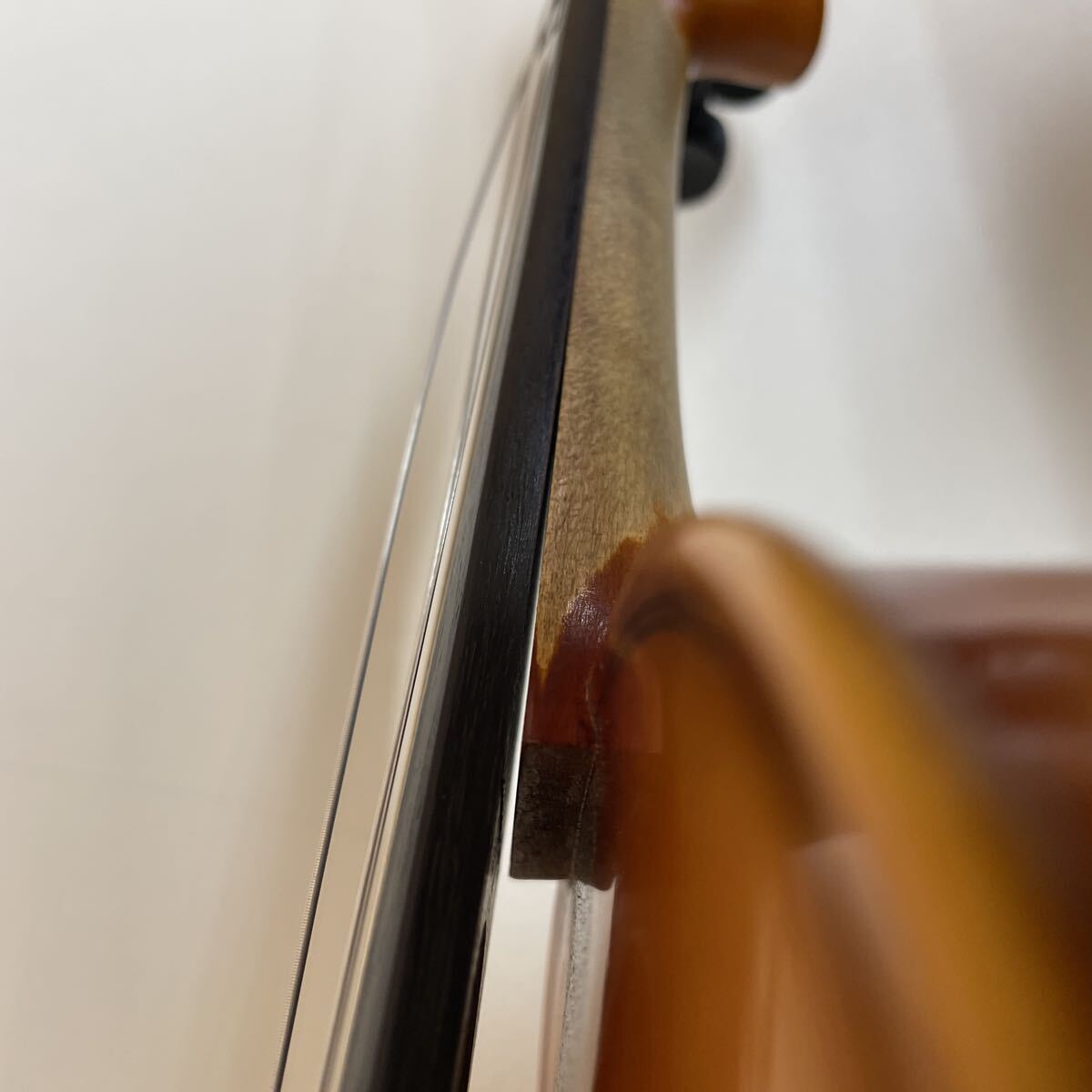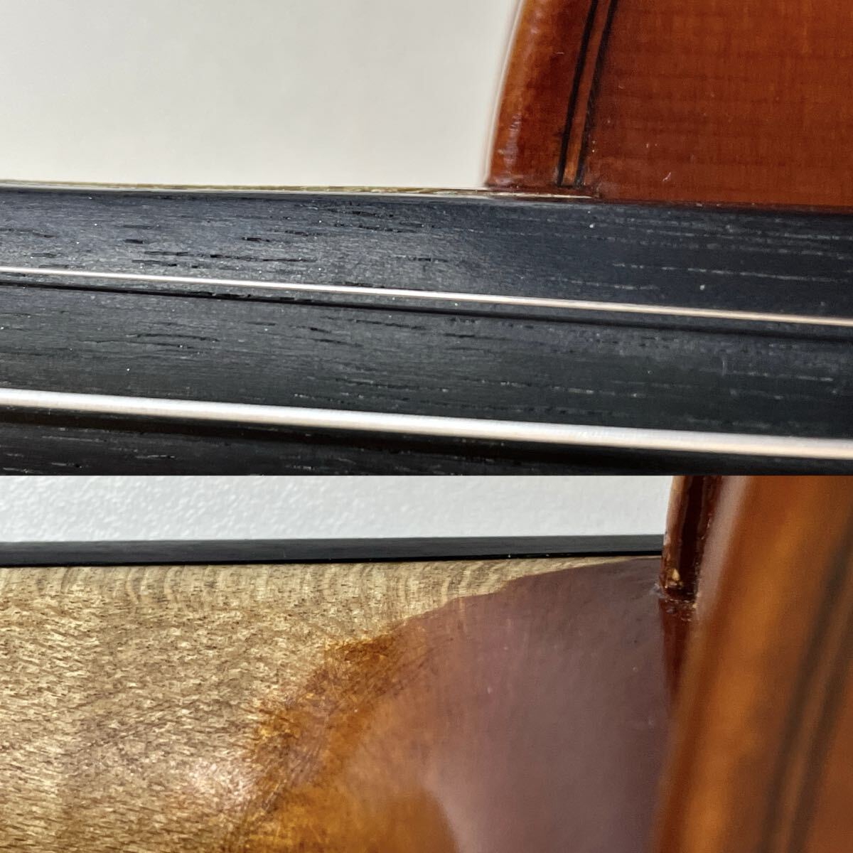 また、剥がれに伴うものか、指板のつき方が少しずれております。ずれた状態でクセがついているように思えます。写真3枚目がその部分です。