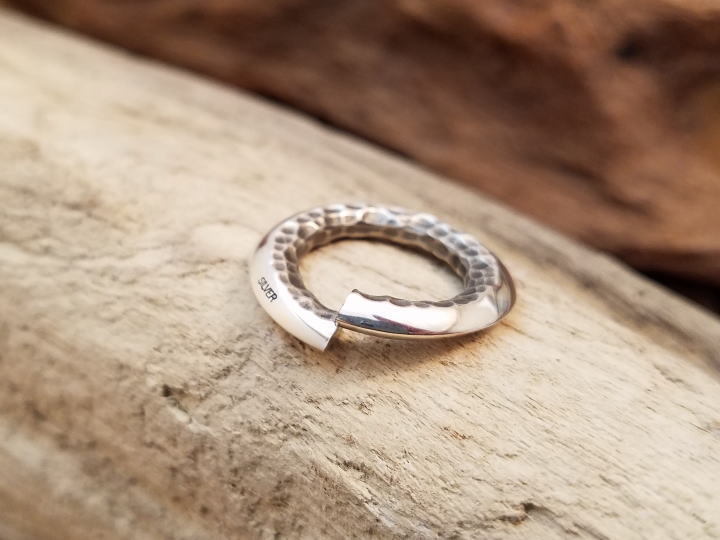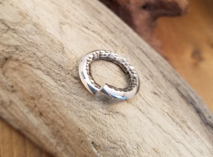 | ◆商品素材 silver925 刻印あり ◆商品寸法 外径21.5mm 内径13.5mm 線径4.0mm ◆デザイン紹介 自社製品のシルバー925製山切りマルカンパーツ単品です。 ハンドメイドで仕上げているので1つ1つ磨きかけています。こちらsilver刻印付きのタイプになります。連結させてブレスレットなどのカスタムや加工に最適のパーツです。 ありそうでなかった理想的な山切り形の丸カンだと思います。 輪の内周に叩きのテクスチャを入れたデザイン性のあるタイプの特大マルカンになります。 ◆付属品 当て革2枚 ペンチ等の工具による開閉時にこの当て革を間に挟むことで製品に傷がつきにくくなります。 傷が付かない開閉方法の動画公開中 https://youtu.be/GENU3ZF8SJY |