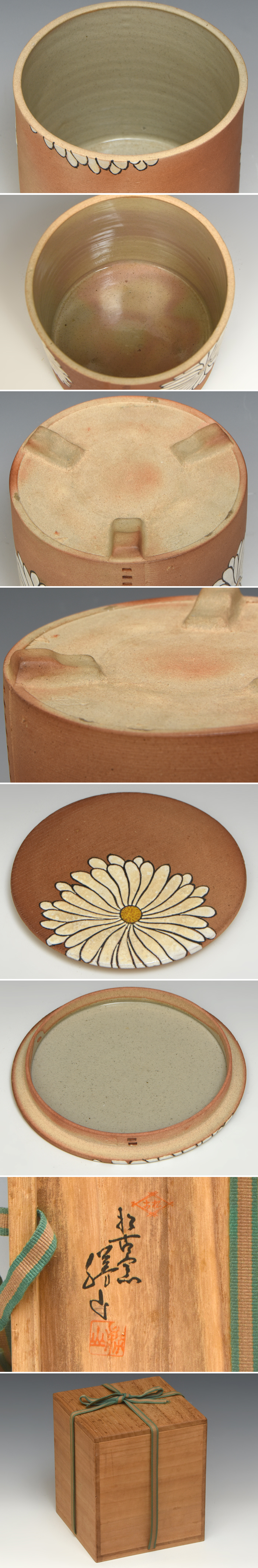 佐久間勝山 木地曲模 菊置上文 水指です。 萬古焼の陶器で出来た、超絶技巧の水指です。 木地曲や菊の置上文様の胡粉の風合いも見事に写されています。 底に窯印がございます。 カケやニュウ、その他のキズもなく、状態は綺麗で良好です。 ※撮影の際に生じた写り込みなどがございます。 ご理解の程よろしくお願い致します。 |
