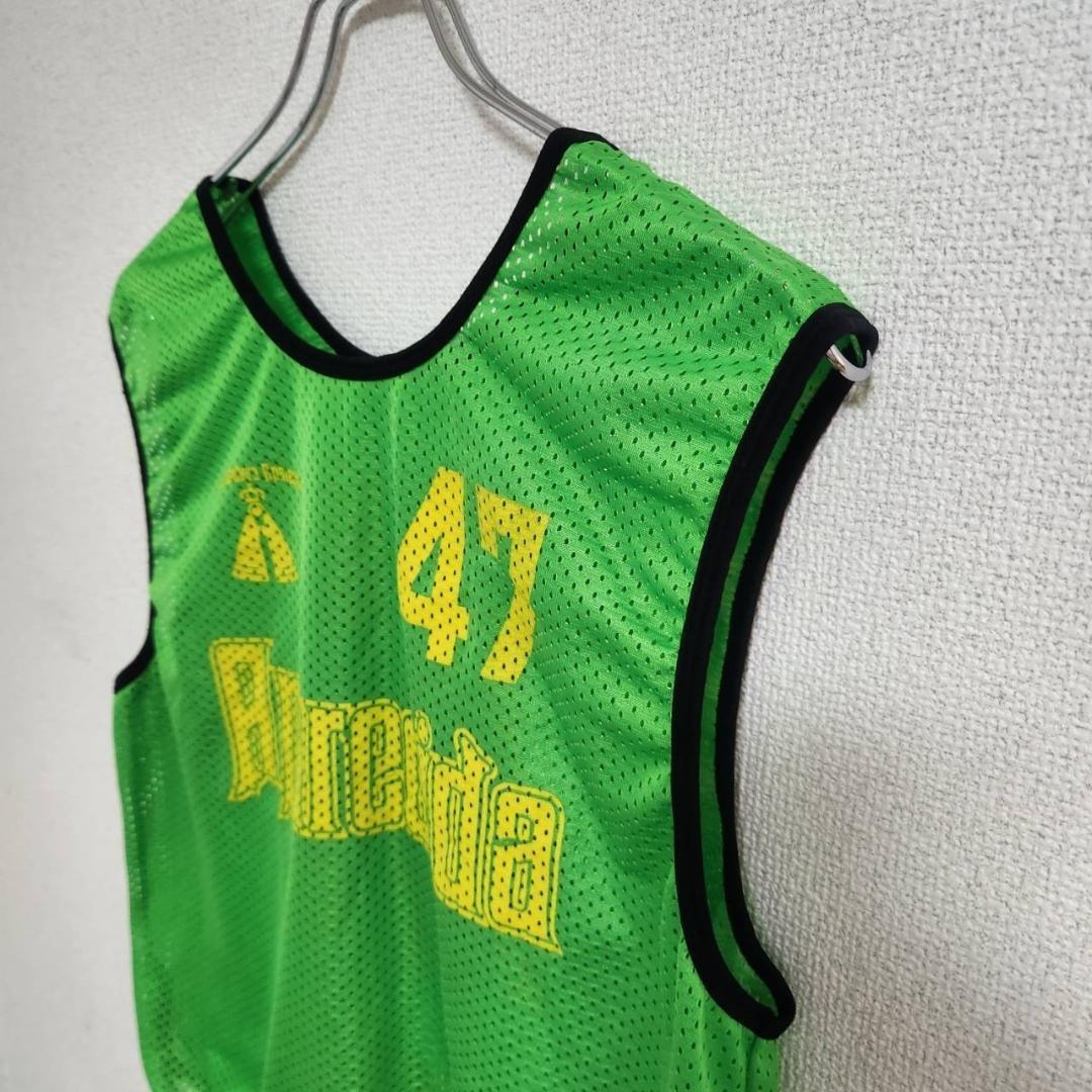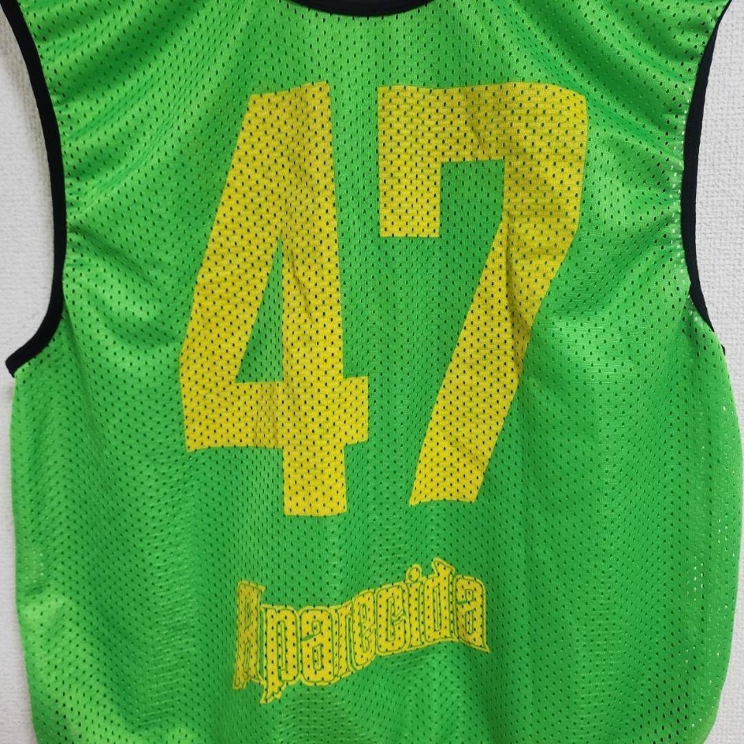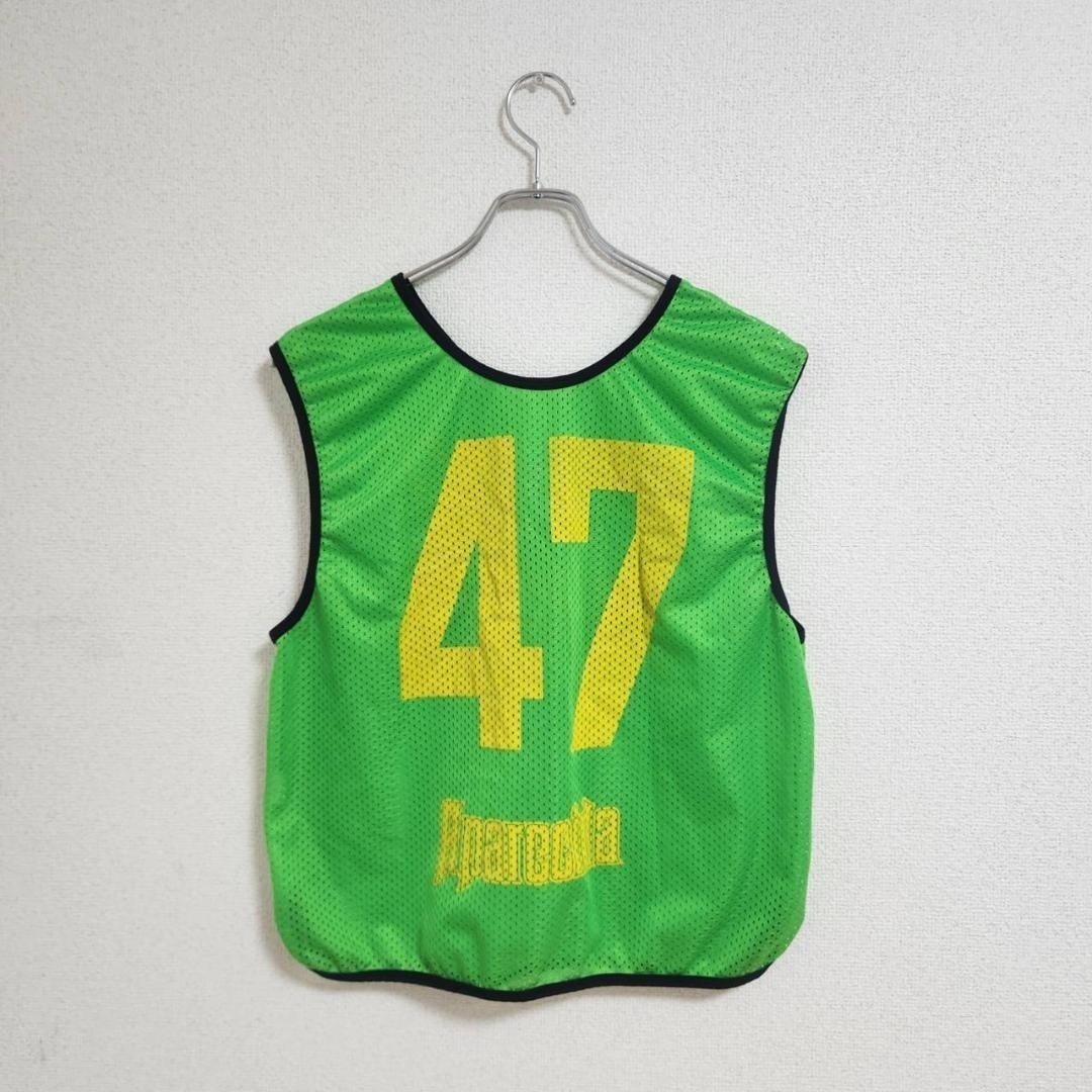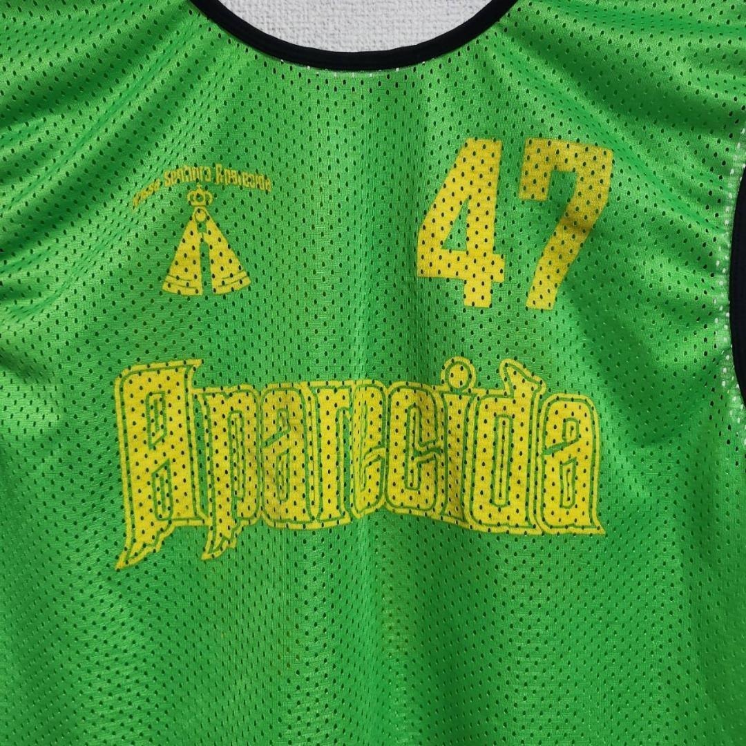 鮮やかなグリーンにイエローの「Aparecida」ロゴとナンバー47がプリントされたスポーツ用メッシュビブスです。軽量で通気性の良いメッシュ素材を使用しており、部活動や練習試合、イベントなどに最適です。肩口や裾には黒の縁取りが施され、スポーティなデザインが魅力です。使用感は少なく、まだまだお使いいただけます。