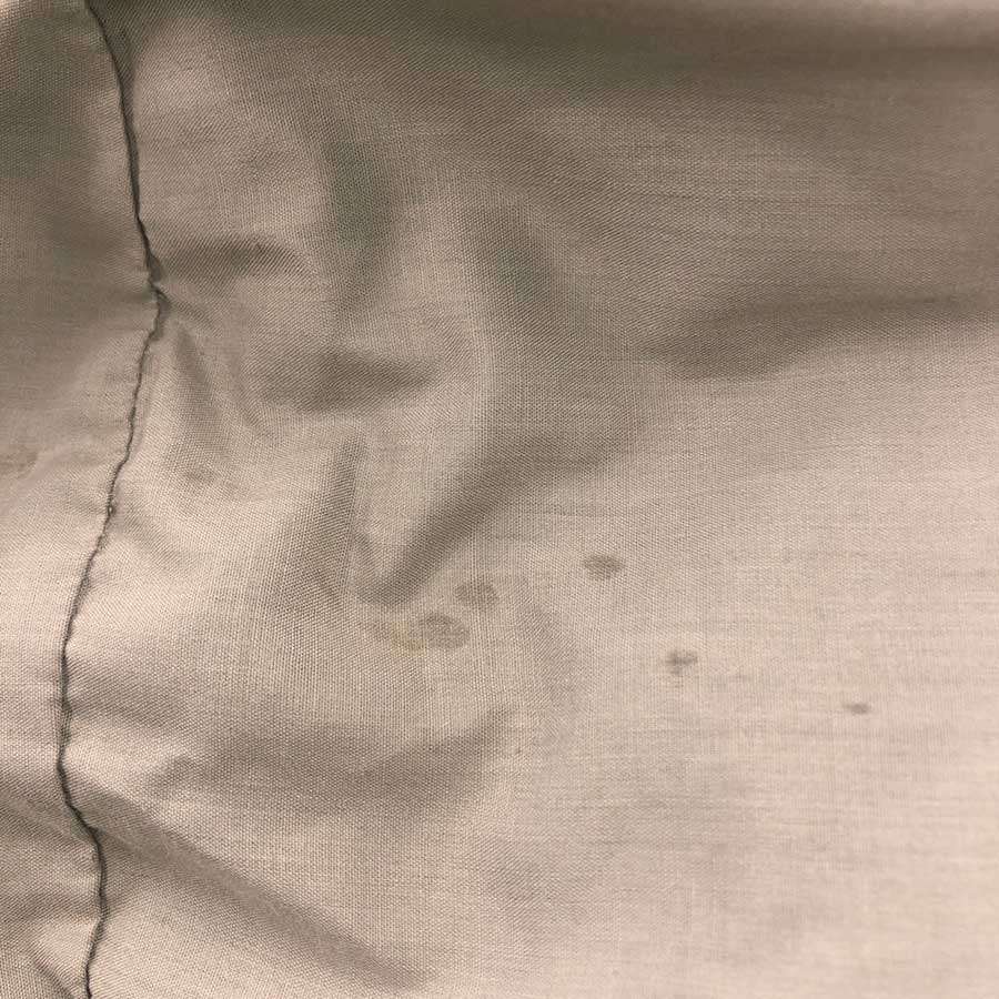 全体的に素材特有の風合い・やや所々に色落ち、フード裏地に数か所シミがございます。