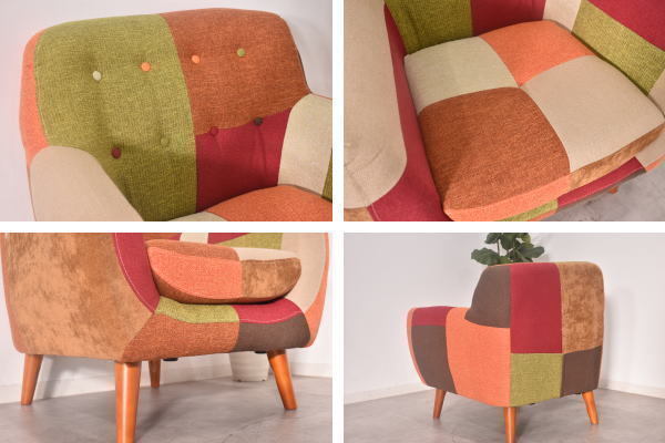 カラフル布製パッチワーク1Pシングルソファーです。 カラフルなボタンに長めの木製脚部がお洒落です。 脚部を外してロータイプとしてもご使用頂けます。 座面はSバネ&ウェービングベルト&厚めのウレタンで適度な反発があり快適です。 |