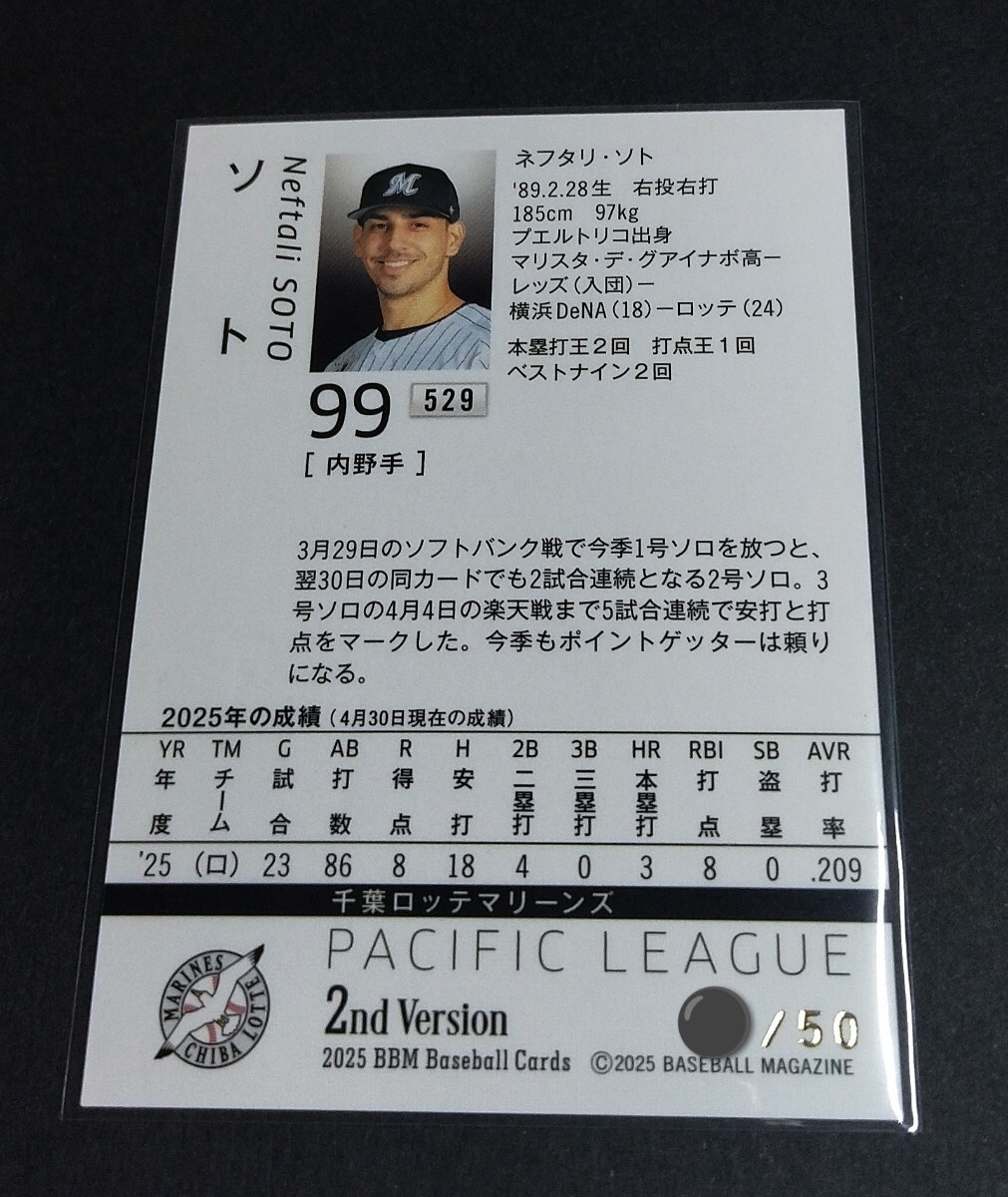 2025年BBM 2nd ソト(ロッテ) 50枚限定 ホロ箔サイン入り。 No,529。NEFTALI SOTO