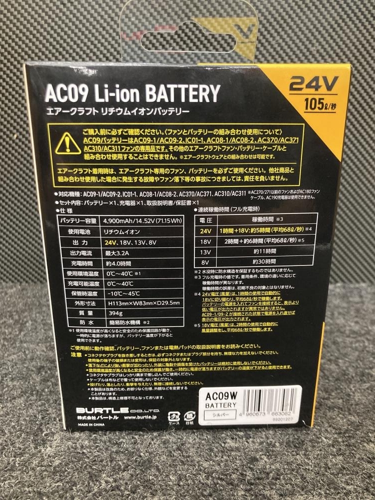 BURTLE バートル ■商品名 エアークラフト 24V空調服バッテリー ■型番 AC09-24V |