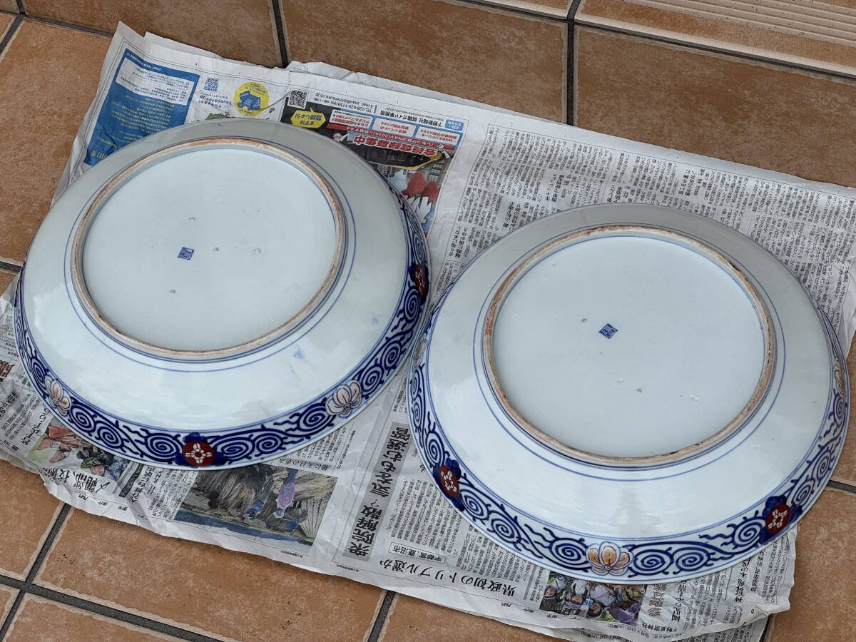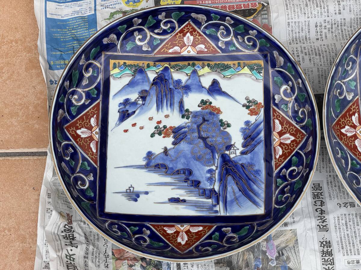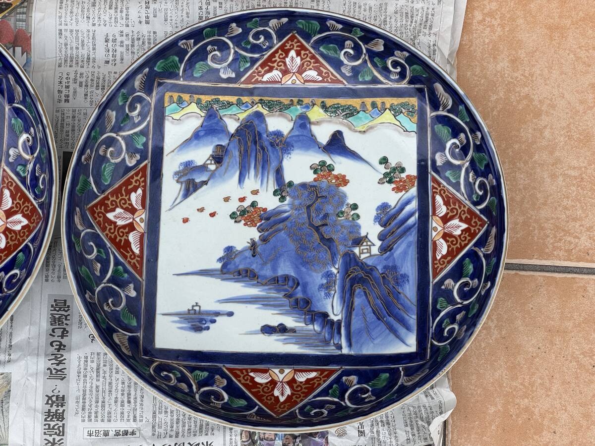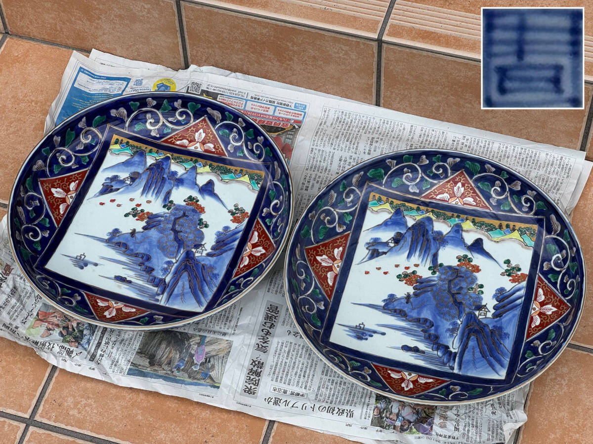 【偲】古伊万里 大型 大皿 染付 色絵 ペア 額皿 山水画 直径約40㌢ 高さ約8㌢ 陶印有り j-212