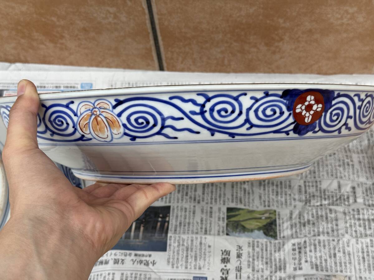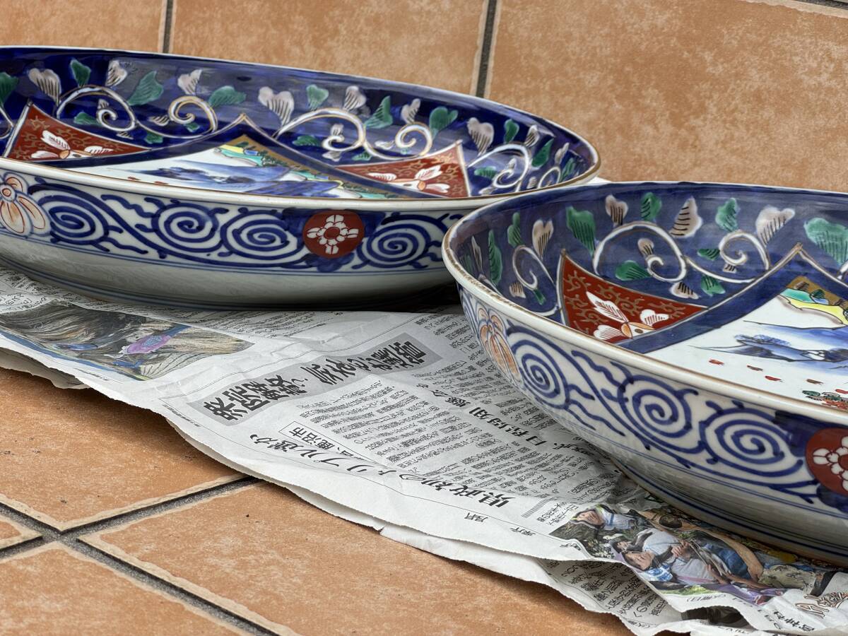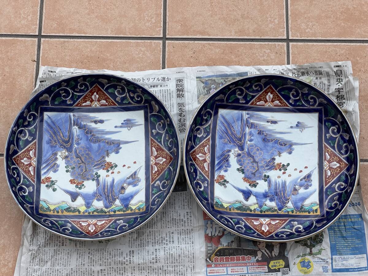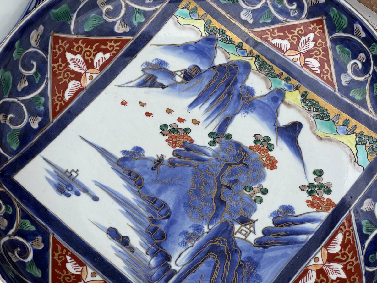 【偲】古伊万里 大型 大皿 染付 色絵 ペア 額皿 山水画 直径約40㌢ 高さ約8㌢ 陶印有り j-212
