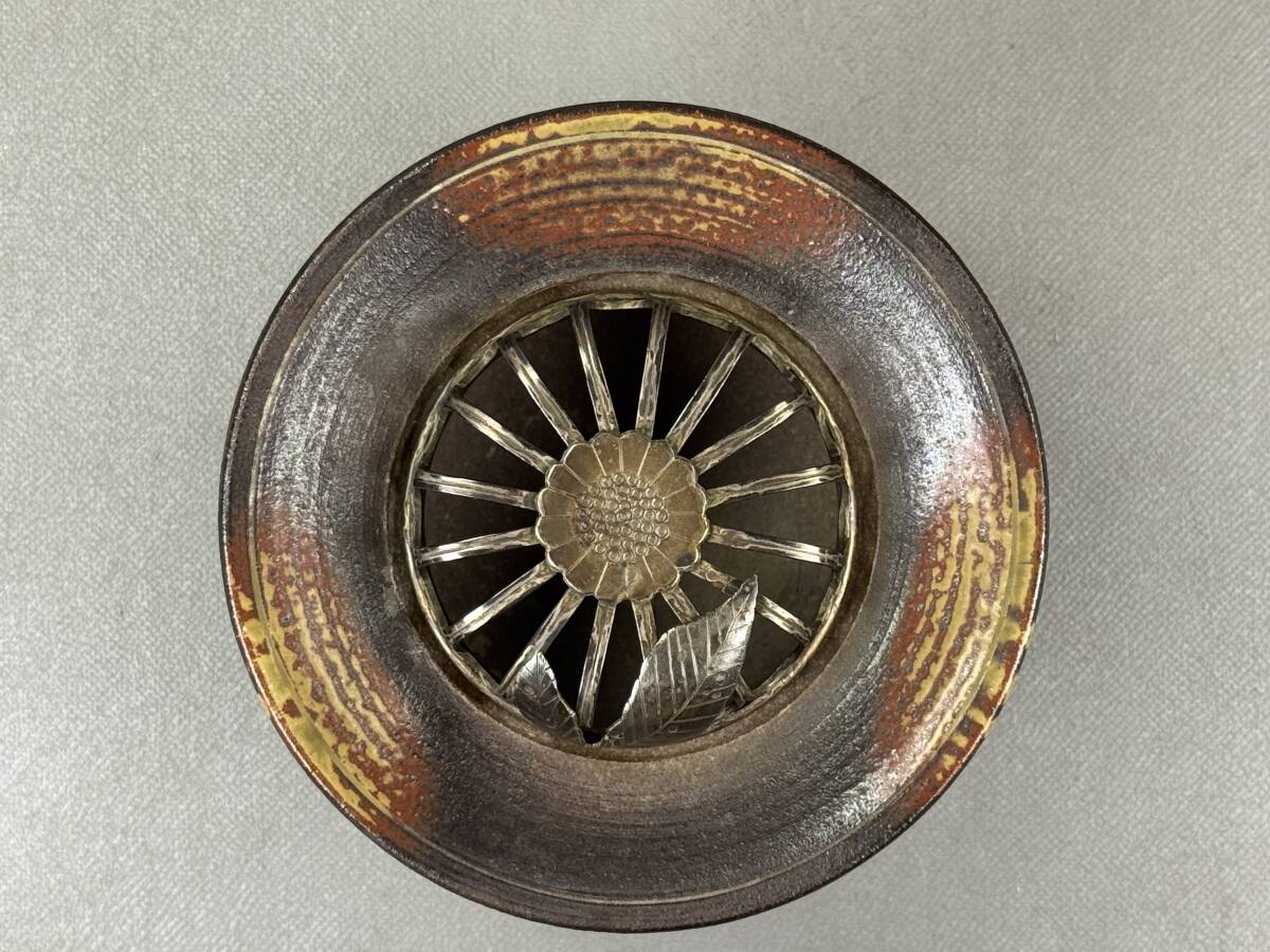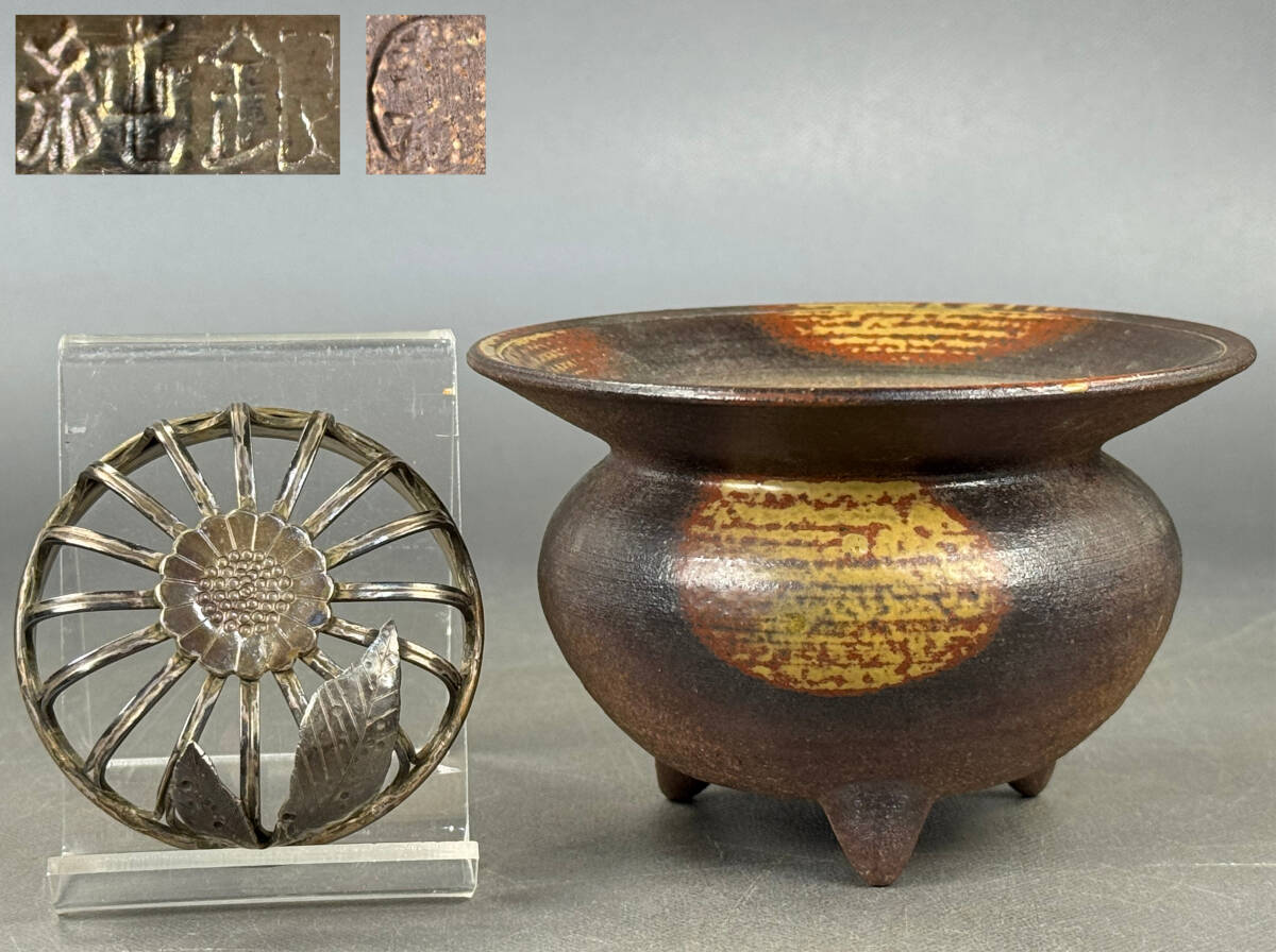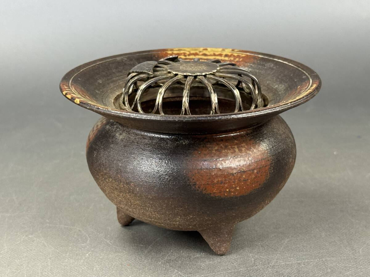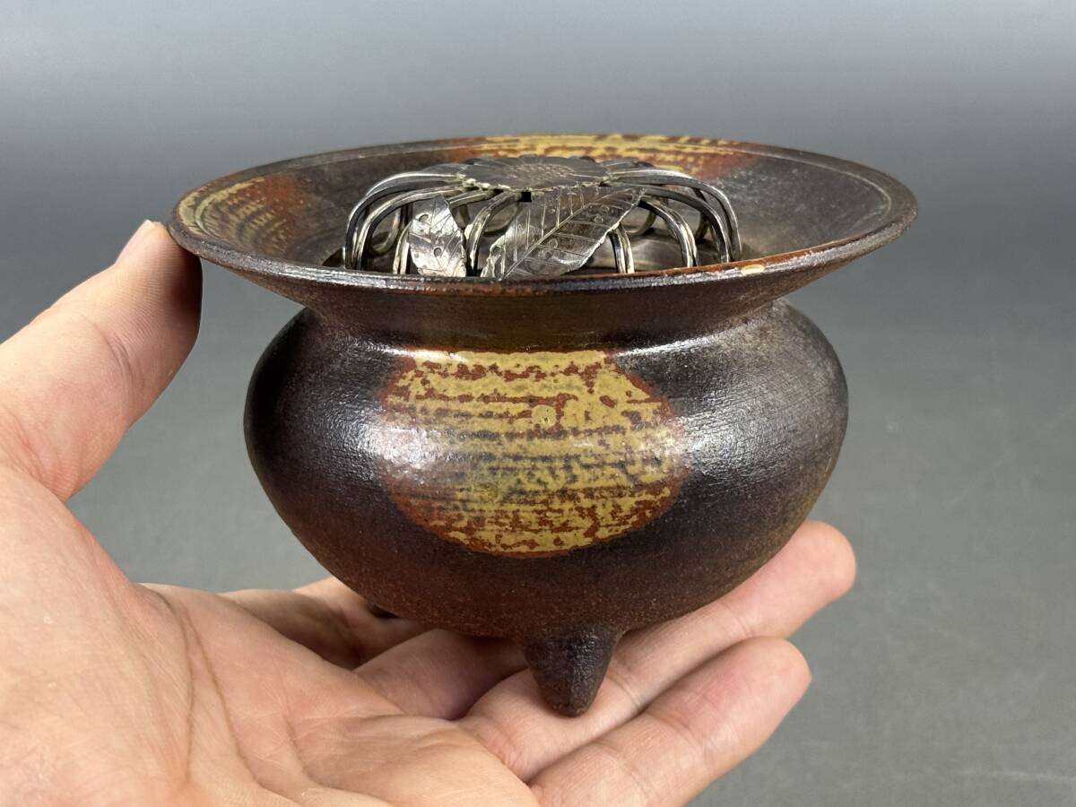 【偲】古備前 純銀火舎39g 香炉 銀火屋 陶器香爐 三足 在銘 高さ約7.5㌢ レトロ 茶道具 p-38