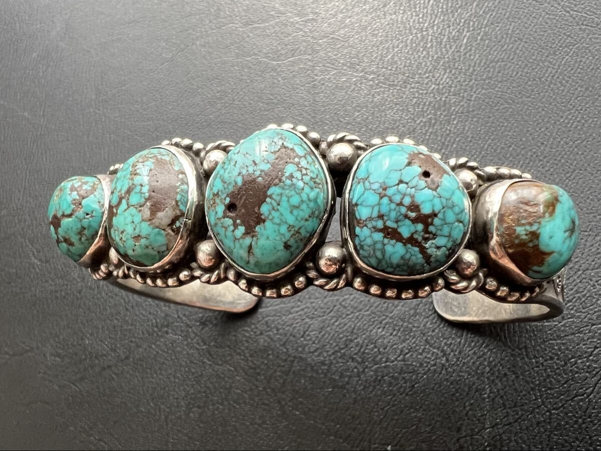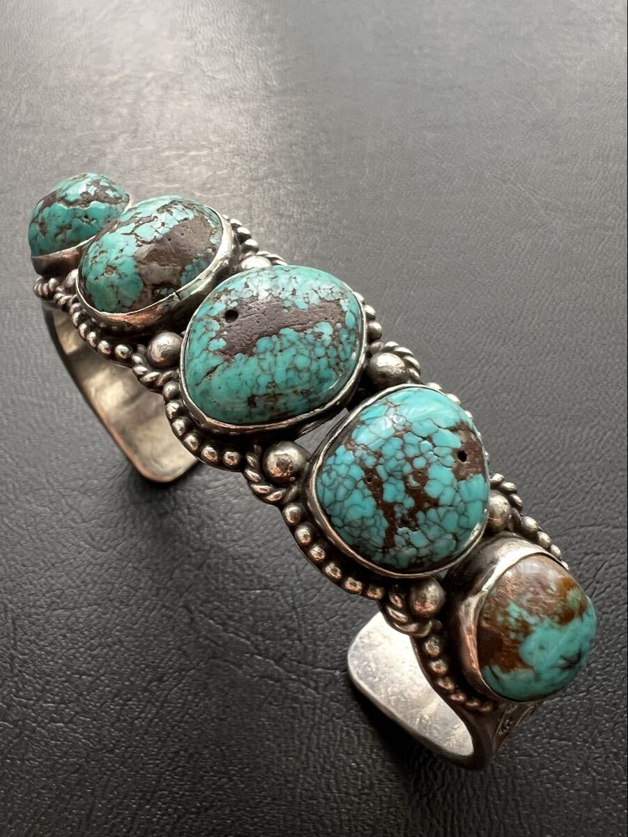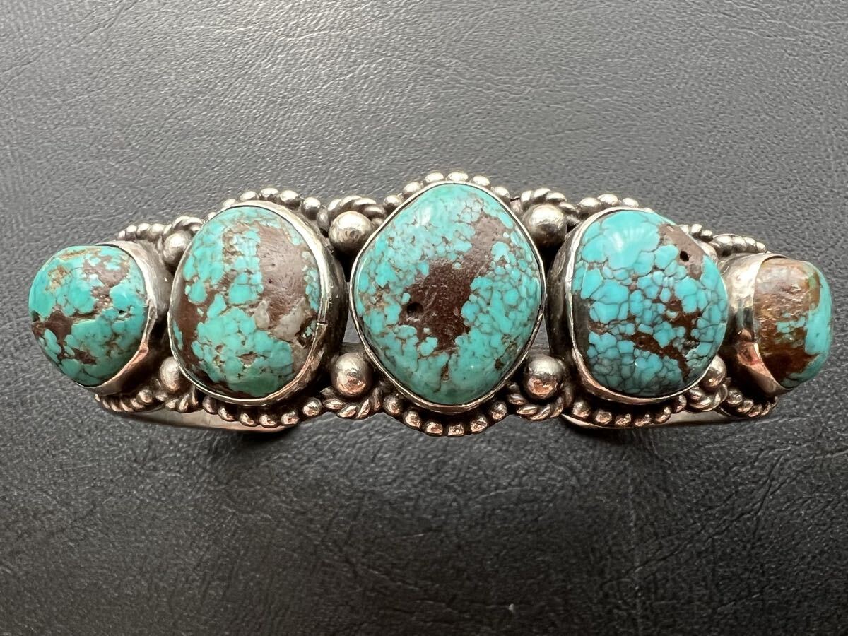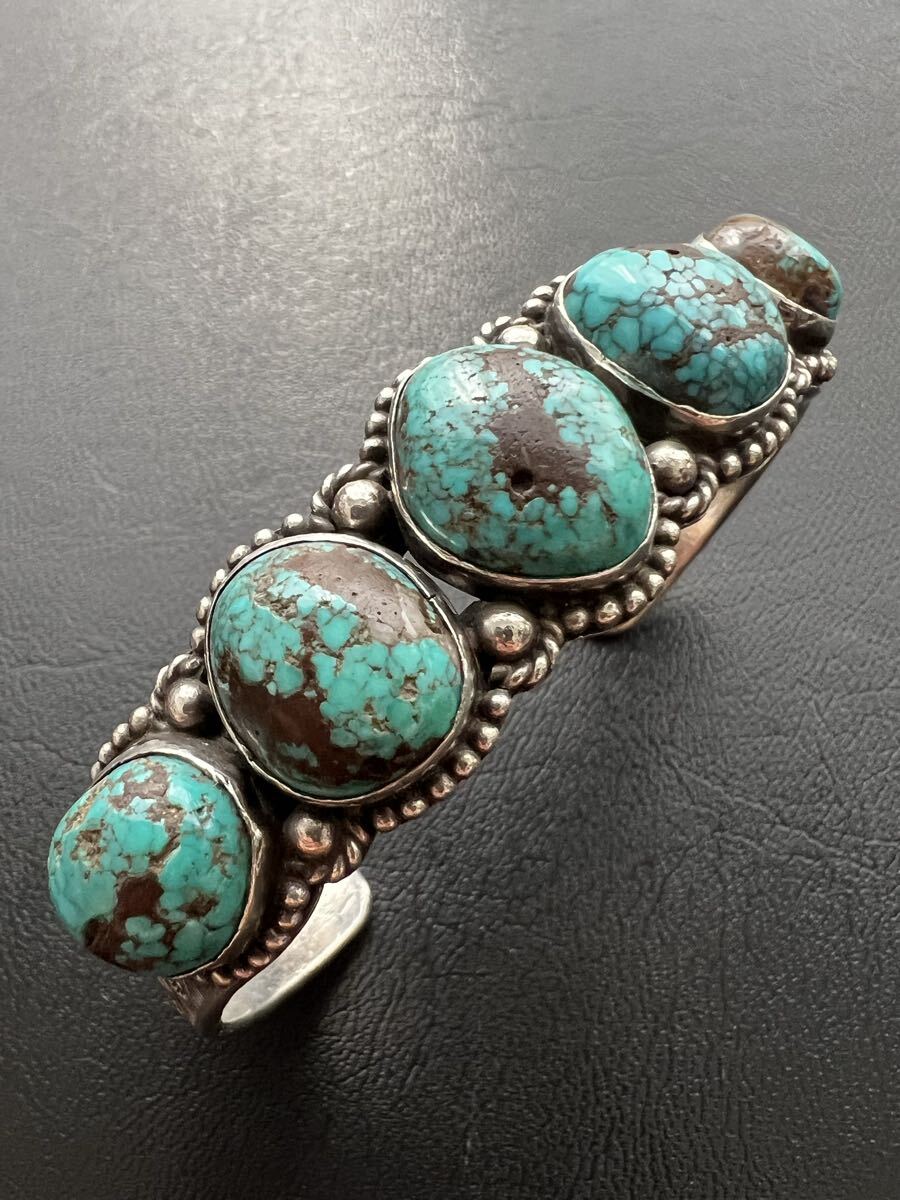 こちらの作品はPerry Shortyによりインゴットから叩き出された素晴らしいバングルで、5個のスパイダーウェブの美しいハイグレード Indian Mountain Turquoiseをセットし、ハイドームに削り出されたターコイズの周りを細かいドロップにより装飾し、アーム部には精巧なスタンプワークが施されたPerryならではのマスターピースになります。