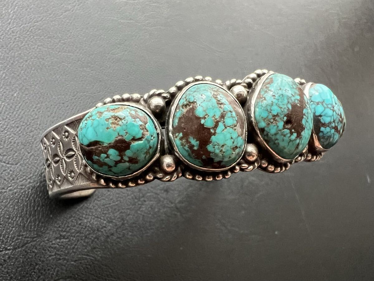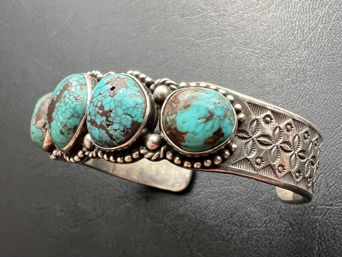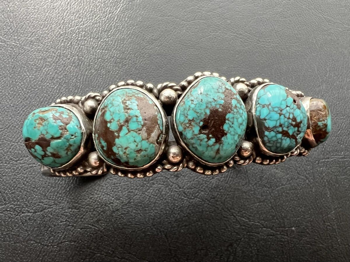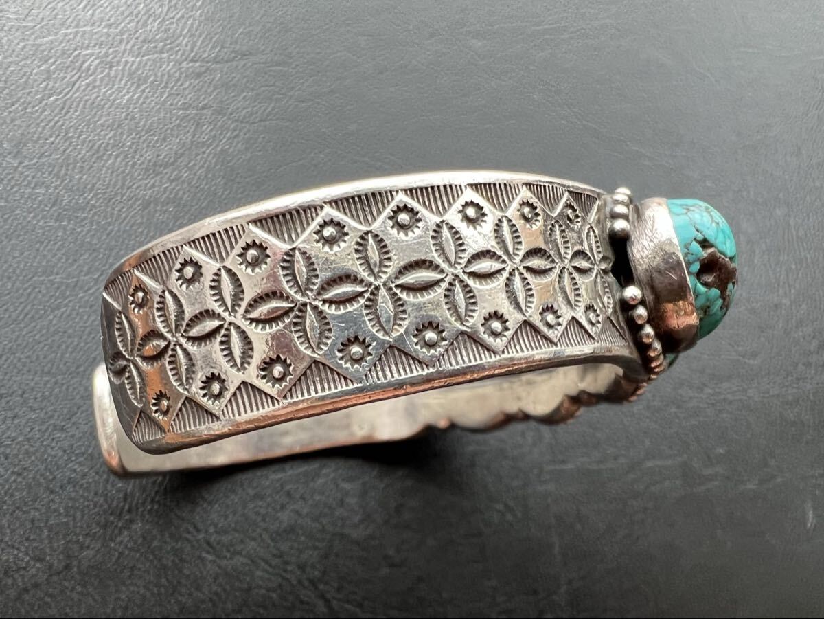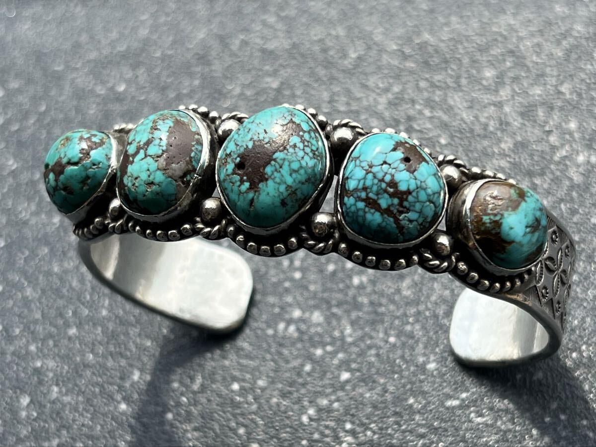 こちらの作品はPerry Shortyによりインゴットから叩き出された素晴らしいバングルで、5個のスパイダーウェブの美しいハイグレード Indian Mountain Turquoiseをセットし、ハイドームに削り出されたターコイズの周りを細かいドロップにより装飾し、アーム部には精巧なスタンプワークが施されたPerryならではのマスターピースになります。