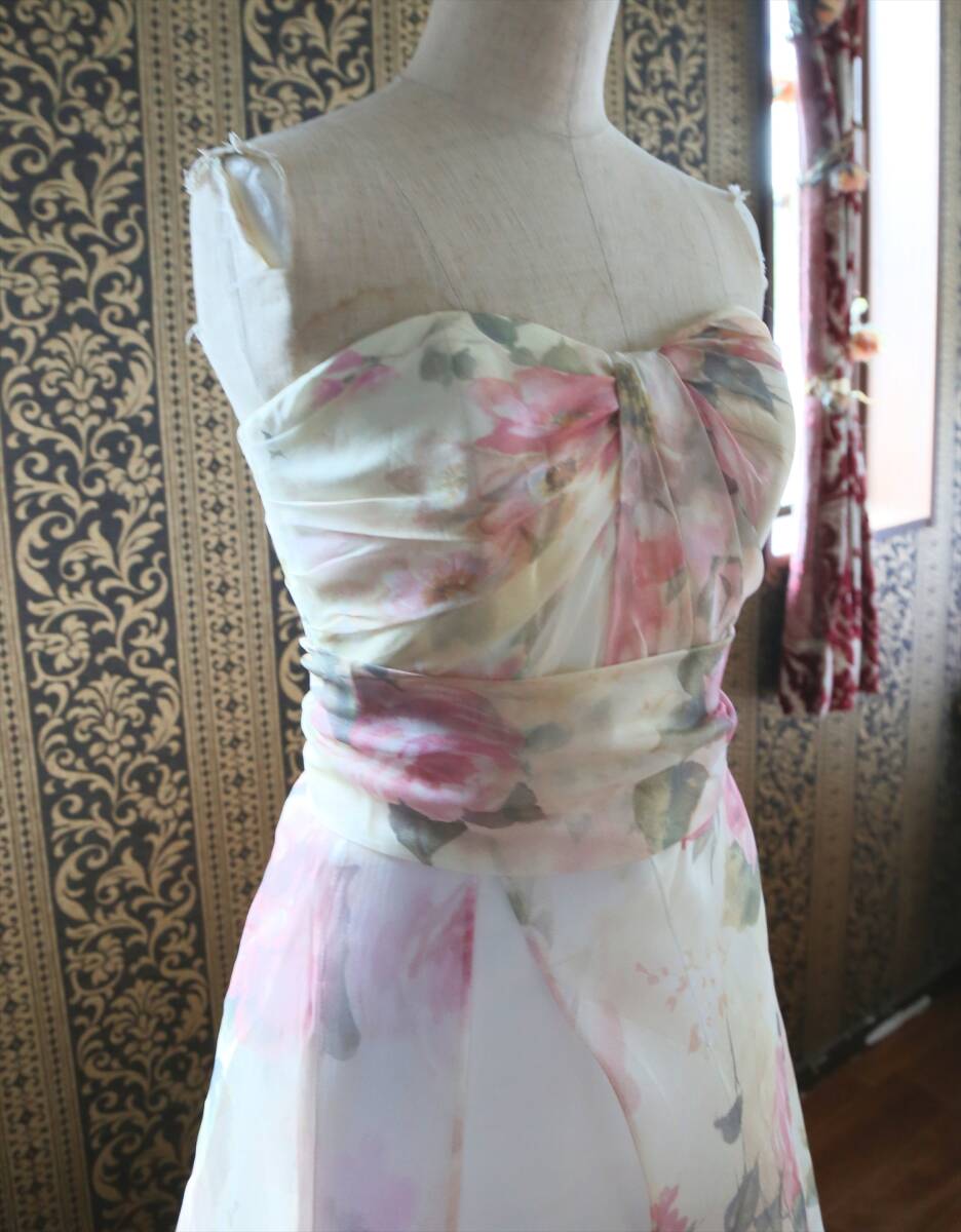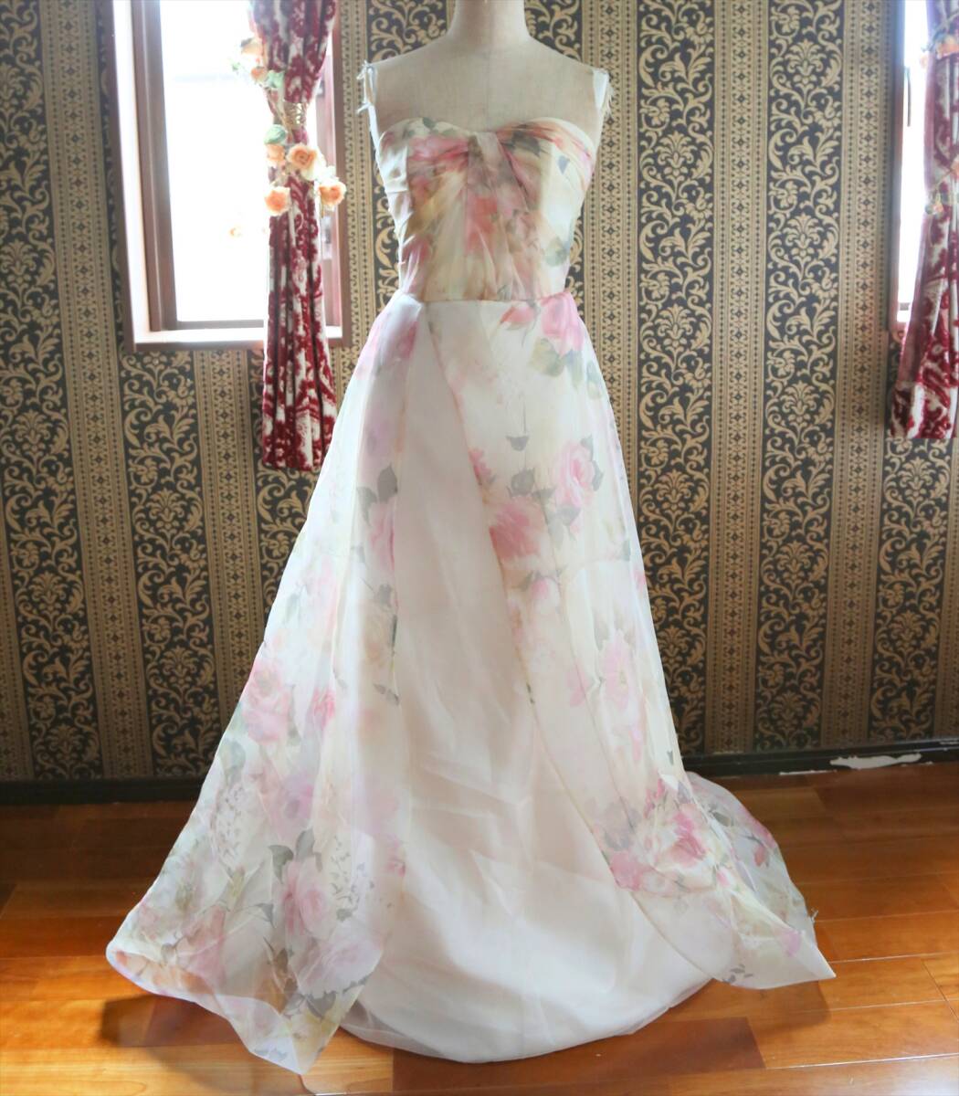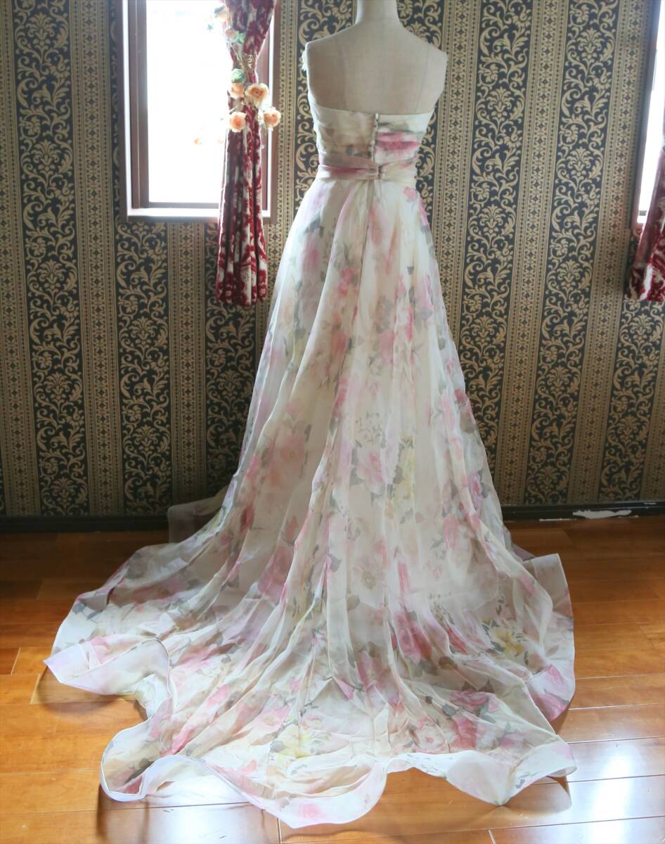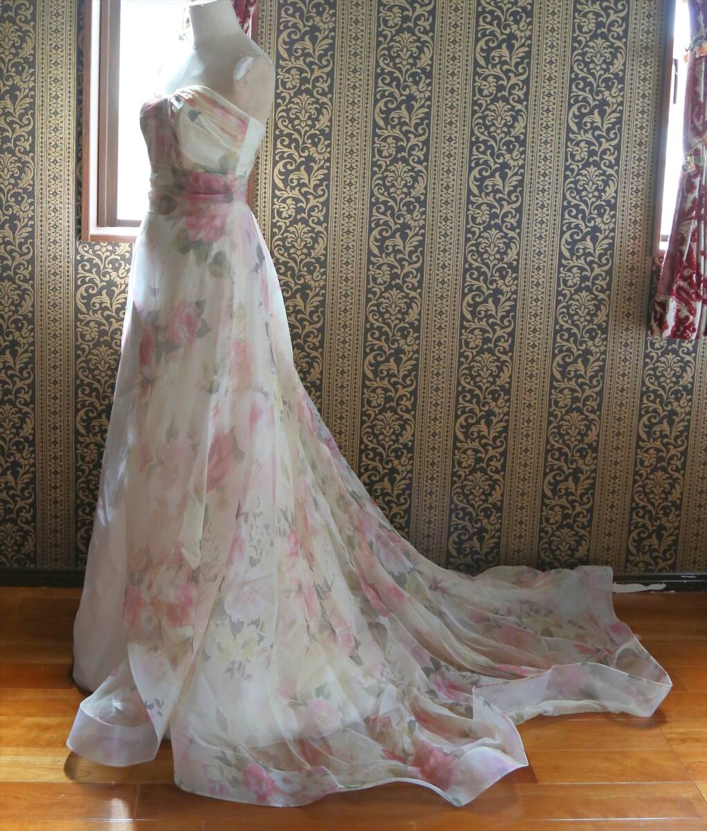 457難ありイタリア製ACQUA CHIARAシルク生地高級ウエディングドレス7号Sサイズ花柄カラードレス