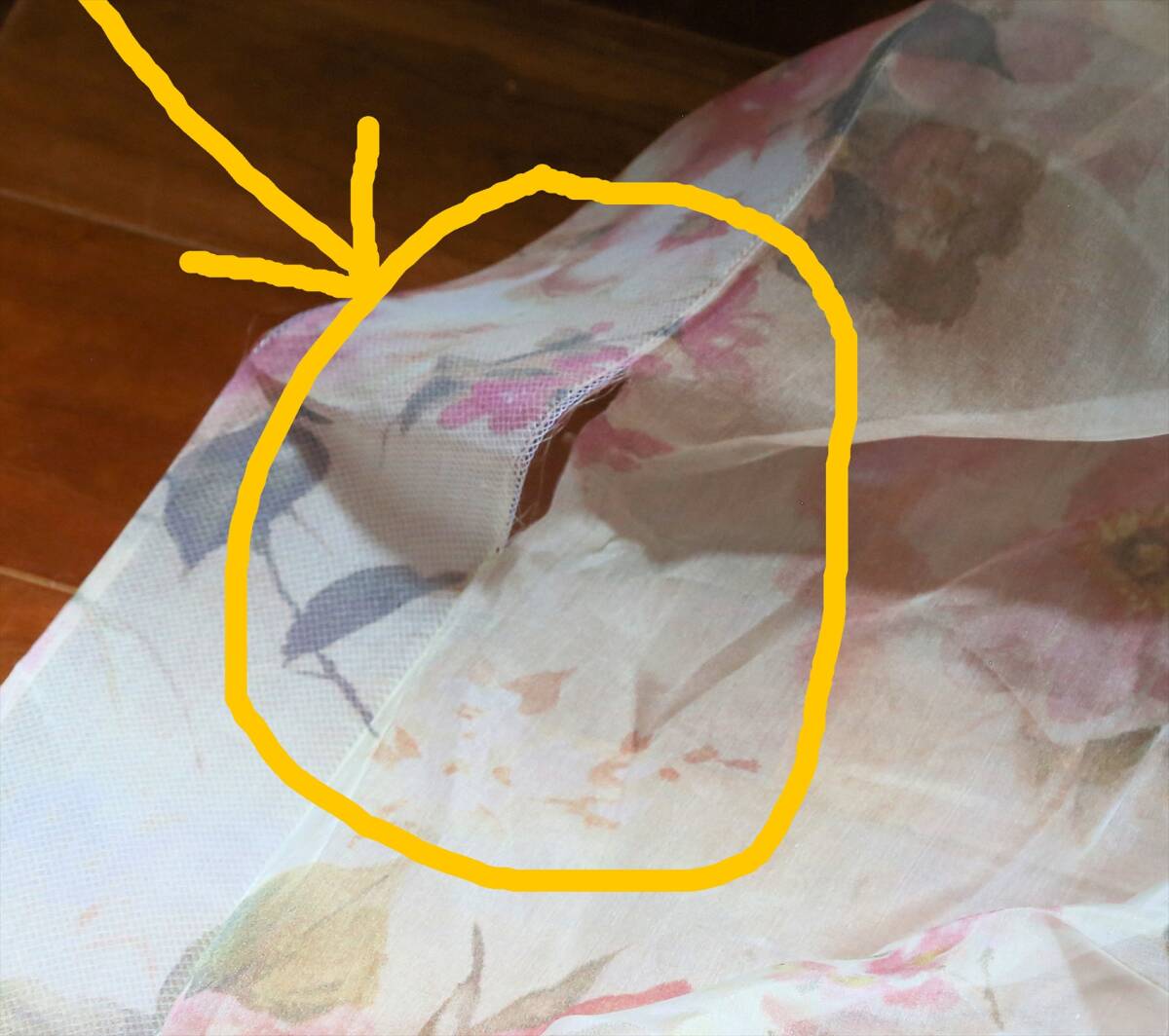 裾にオーガンジーの破れが若干あり、修理店で相談しましたが、繊細な生地の為修理しても修理した部分に負荷がかかり逆に破れが広がってしまう可能性があり、現状で使用する方が良いとの事です