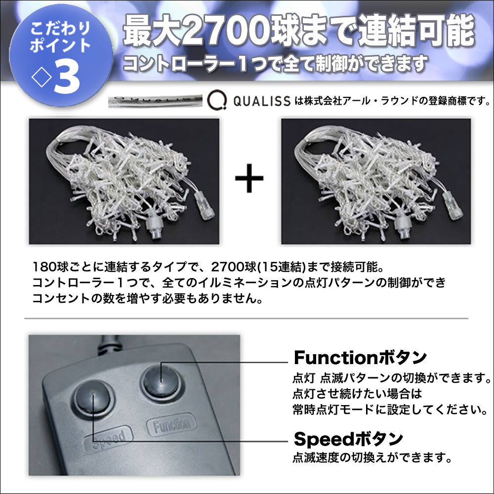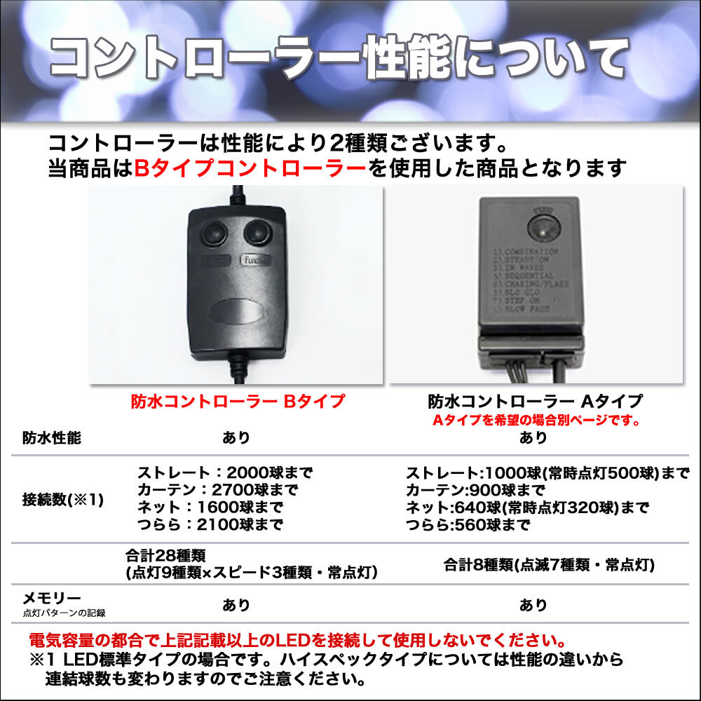 | 長さ 13m 720球 白・シャンパン Bコントローラー 付 ![]() 最近は、LEDイルミネーションも各社が販売しており、 会社はもちろん、自宅等にもイルミネーションを飾り付けするケースも増えてきました。 イルミネーションで、木、庭、クリスマスツリー 等をライトアップでき、 明るく印象を変える事ができます。 最近は、価格安いイルミネーションも増えていますが、 品質面に不安を感じた事はありませんか? 「防水性能がしっかりしておらず壊れた…」 「LEDの明るさが暗い…」 「コントローラーの作りが簡素で不安」 等々で、失敗されたお客様、 品質にこだわったイルミネーションを使ってみませんか? 当社のイルミネーションは、購入してから 安心してお使い頂く為に、 とにかく品質面にこだわった商品です。 こだわりのポイントをご紹介いたします。 ![]() ![]() ![]() ![]() ![]() ![]()