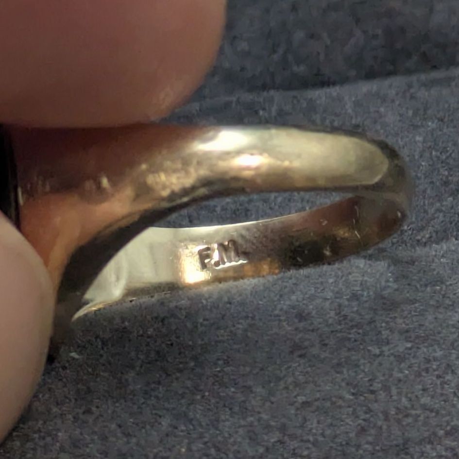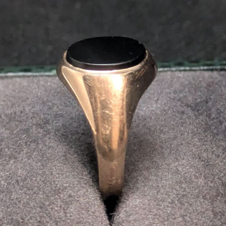 ヴィンテージ品として良好な状態です。ゴールド部分に経年による小傷はありますが、オニキスの色艶は美しく、ホールマークもはっきり確認できます。写真でも刻印と石のコンディションを丁寧にご確認いただけます。