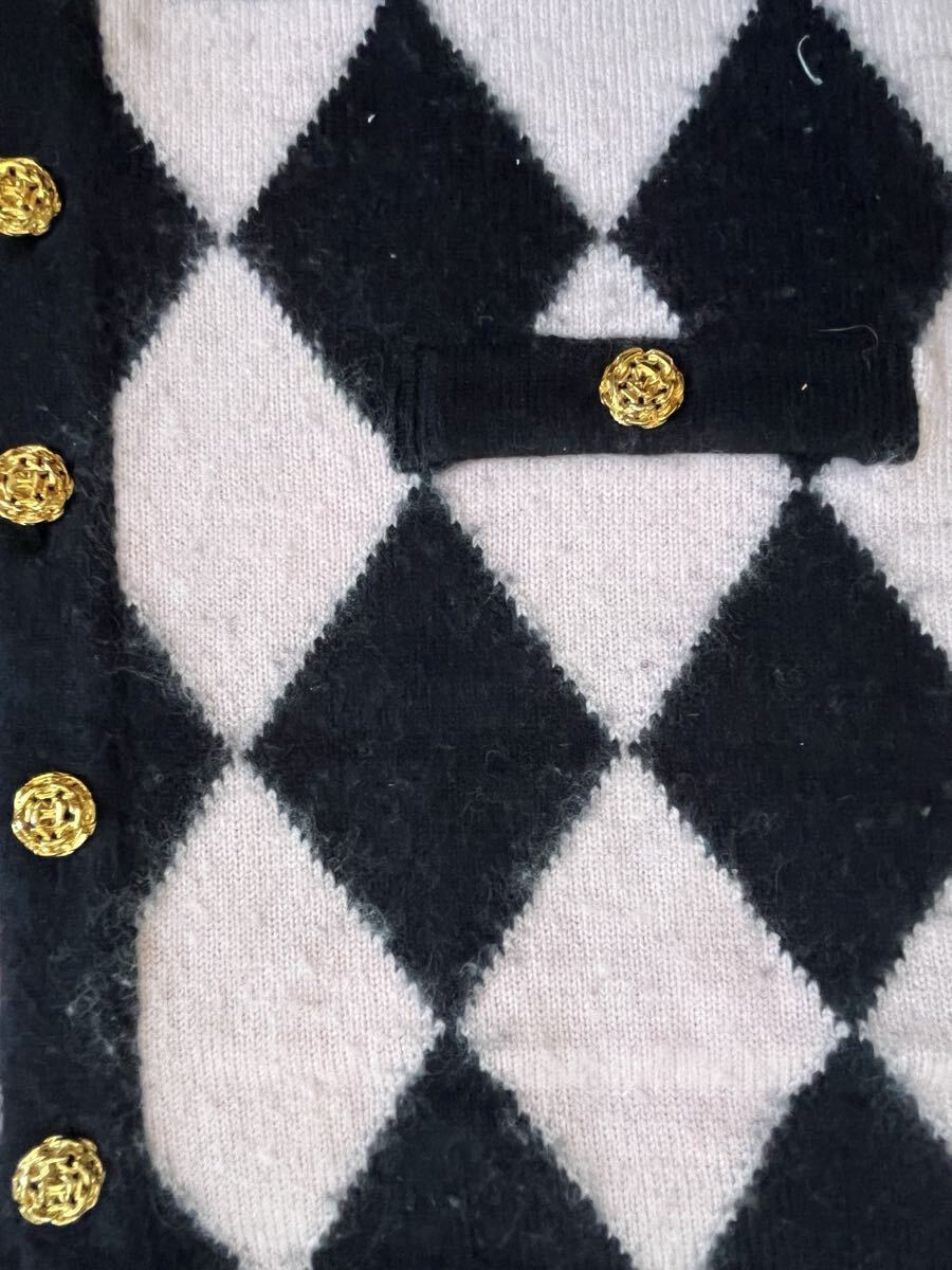 黒とピンクのダイヤモンド柄の長袖カーディガン、金色のボタンとポケット付き。