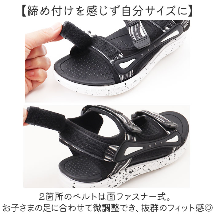 | 商品説明 | ・・【夏のお出かけの相棒に☆】 ・サッと履けて、ムレにくく快適。夏にヘビロテ間違いなしの「キッズ用サンダル」。 ・【シンプルなスポーティールックス】 ・カジュアルなスポーティーデザイン。ラフなスタイルにマッチし、デイリー使いに。 ・【締め付けを感じず自分サイズに】 ・・2箇所のベルトは面ファスナー式。お子さまの足に合わせて微調整でき、抜群のフィット感◎ ・【汗ばむ季節にぴったりな仕様】 ・つま先が開いたオープントゥデザイン。全体的に開放感があり、真夏でもムレにくい! ・【足裏を優しく受け止めてくれる】 ・足裏に直接当たる部分は、ソフトな素材を使用。衝撃を抑えて足が痛くなりにくい! ・【屈曲性があり、つまずきにくい】 ・足の動きに合わせて柔軟に曲がる形状。蹴り上げやすくつまずきにくいのが嬉しい◎ ・【安定感があり、歩きやすさが向上】 ・程よい厚みのソールで、前後差を抑えたつくりで安定感アリ! ・【滑り止め付き】 ・靴底には凹凸が付いており、滑りにくくレジャーシーンでも活躍! ・【アクティブシーンにおすすめ】 ・軽やかな履き心地で、長時間履いても大丈夫。アウトドアシーンなどにも。 ・【成長に合わせて選べるサイズ展開】 ・兄弟・姉妹でお揃いや色違い揃えもできる、豊富なサイズをご用意!お好みで選んで夏を満喫☆ |