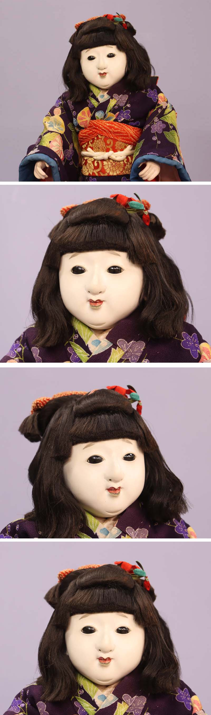 鼻と右目の目尻周辺に色足しがあり、左目尻付近と右耳前方に細かい胡粉のヒビがあります (画像上から 8, 9, 10 枚目参照)。