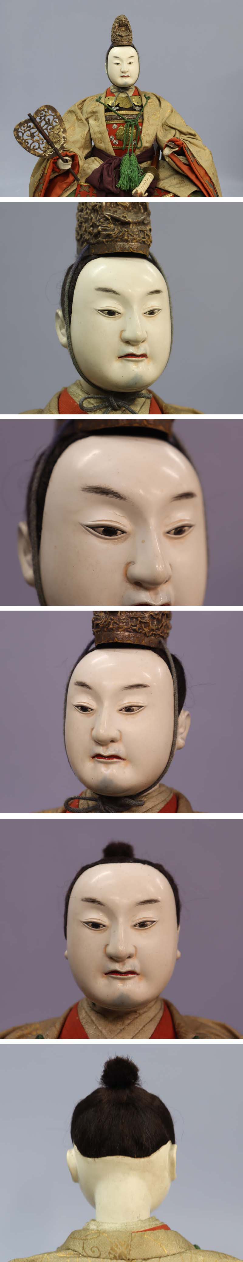 右目の上に1ヵ所細かい胡粉のヒビがあり、お顔にホクロ状の細かいシミが所々見られます (お顔アップ画像参照)。