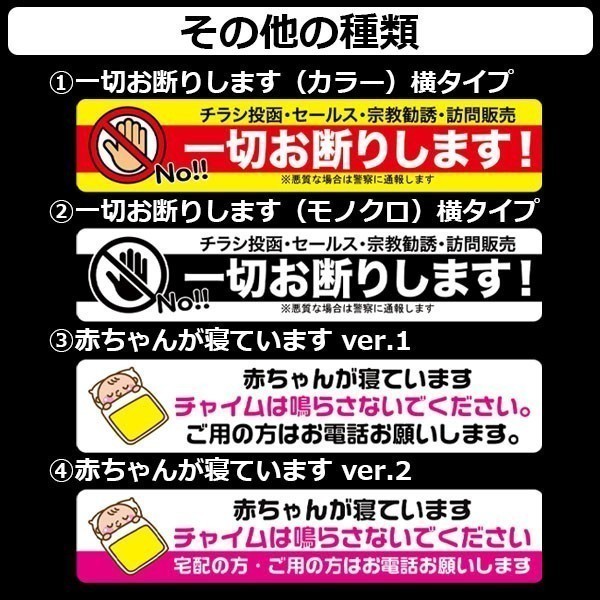 しつこい迷惑で悪質な訪問者に一切お断りステッカー! セールスマン、防犯対策、訪問販売、宗教勧誘、新聞勧誘、NHKに効果てきめん! ポストやインターフォン、玄関ドア付近にご利用ください。 ◎この商品は文字変更・サイズ変更ができません◎ 落札価格は1枚の価格です。 ●サイズ:縦30mm×横150mm ●耐候年数:3~5年 ●UV加工、防水加工 |