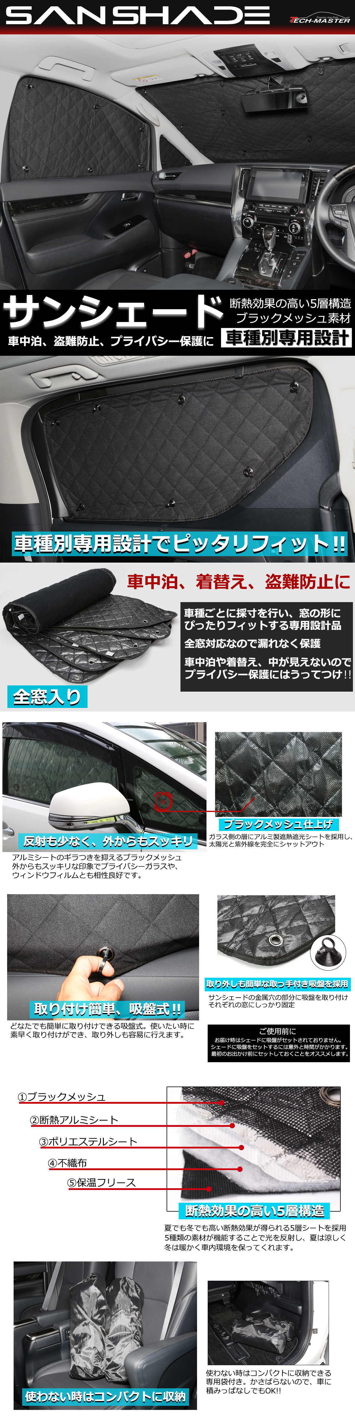 ■商品コード SZ811 ■商品タイトル 車種別専用設計 サンシェード 全窓対応 1台分 ■適合車種 ヴェゼル RU1 / RU2 / RU3 / RU4 全窓対応(6枚) ■素材 5層構造、外側から ・ブラックメッシュ ・断熱アルミシート ・不織布 ・保温フリース ■特徴 車種別専用のサンシェードです。 熱遮断・保温性に優れ、全窓対応のため、車内を覗かれる 心配がないため、カーナビなどの盗難を防げ、また、 アウトドア時の着替えや、車中泊の夜中に眠るときも 安心して睡眠がとれます。 ■注意事項 窓に取り付ける用の吸盤はサンシェードに取り付けられてはいません。 取り付けにお時間がかかりますので、初回使用前に あらかじめ取り付けて置くことをお勧めします。 |
