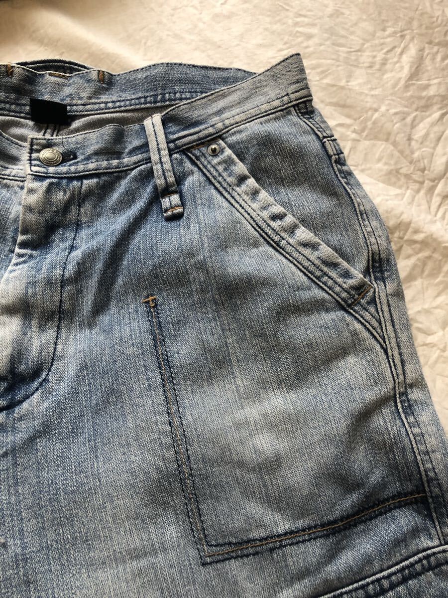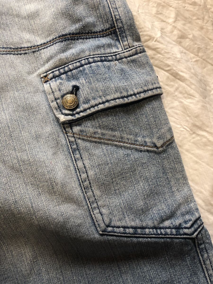 ライトブルーのデニム素材で、4つのポケットを備えたカーゴショートパンツです。