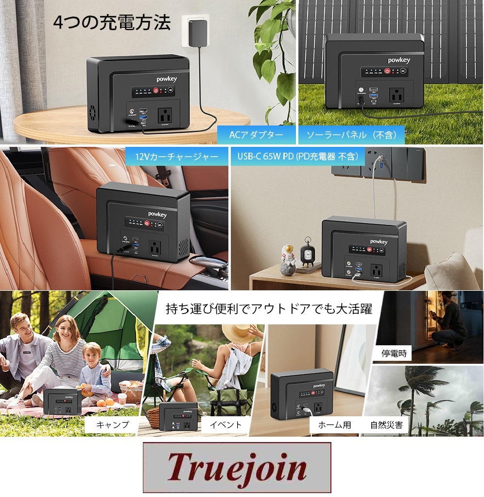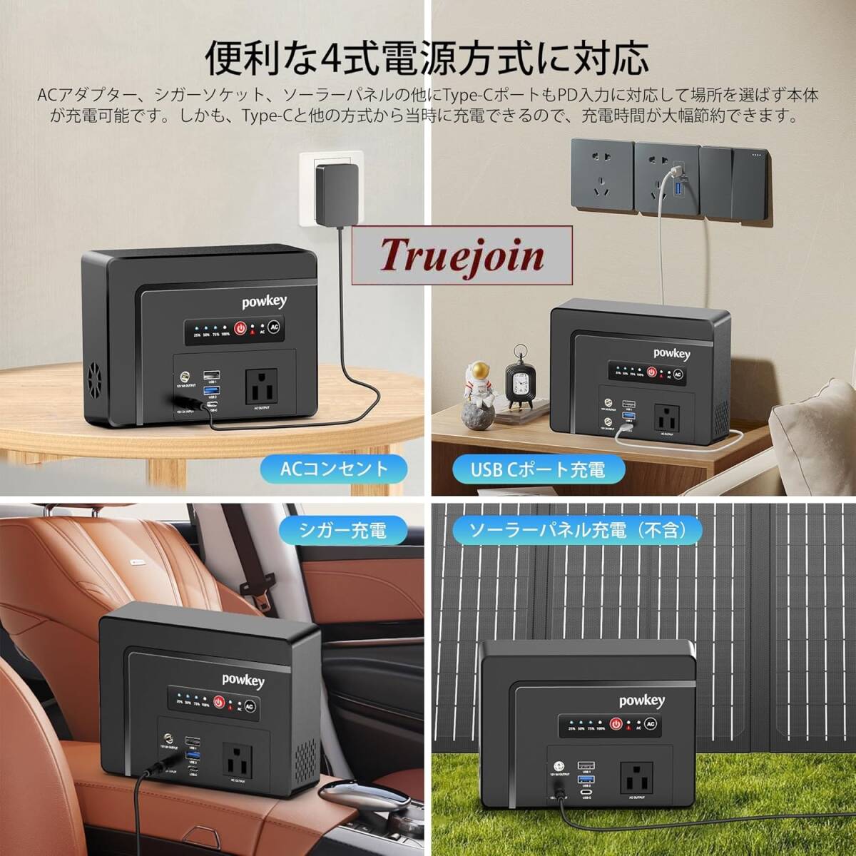 AC/DCコンセント、カーチャージャー、USB Cポート充電,ソーラーパネル(別売り)などの充電方法に対応します。