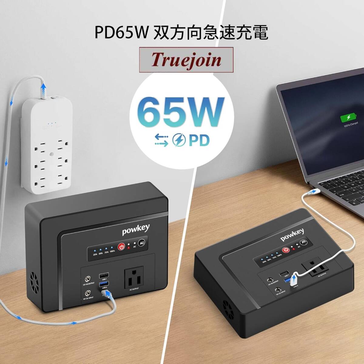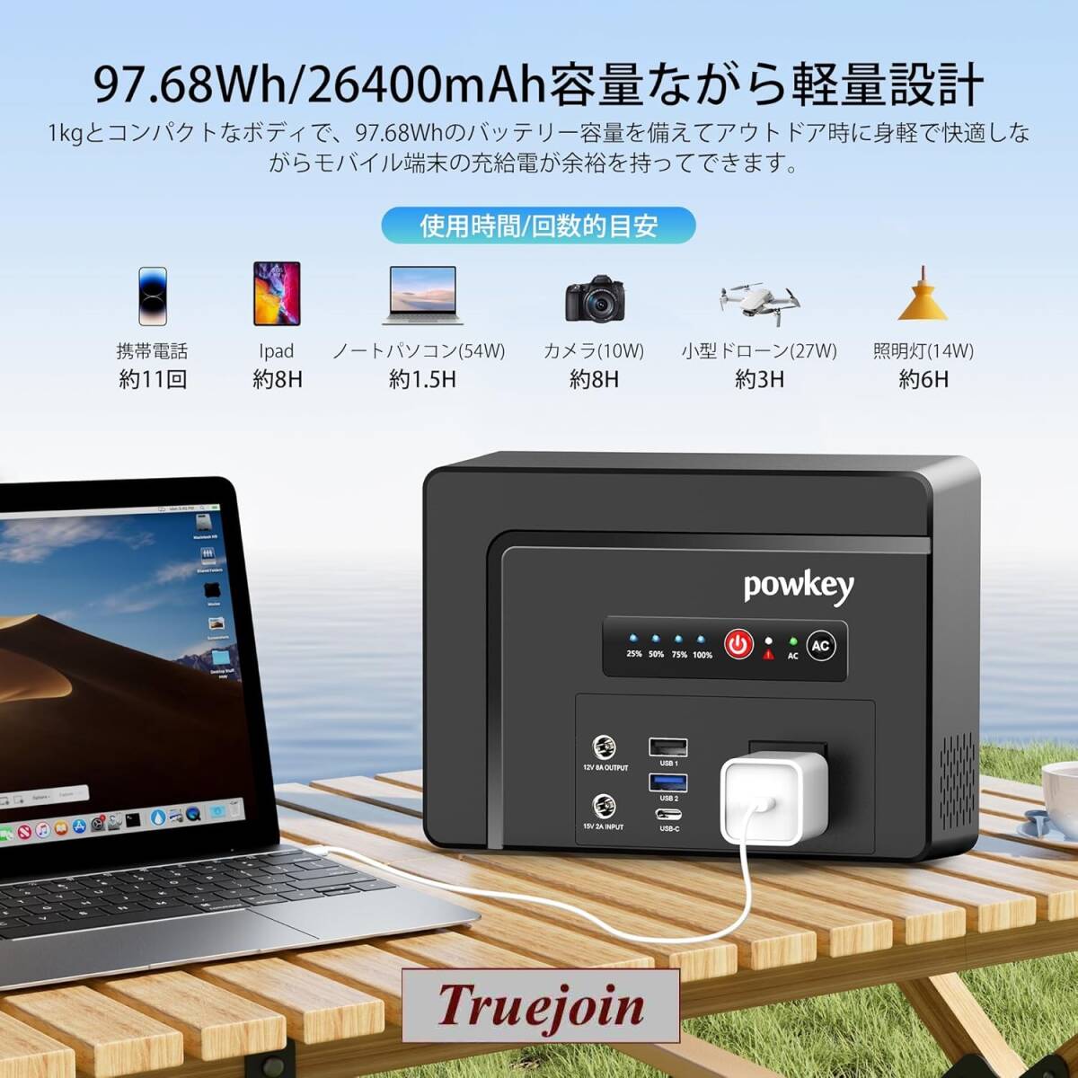 AC出力は100Wあり、携帯電話、ラップトップ、アイパッド、カメラ、ドローンなどの電子製品に対応できます。