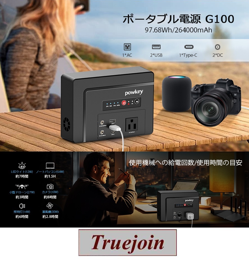 ポータブル電源 G100 97.68Wh/26400mAh 非常用電源 大容量 ポータブルバッテリー 小型 AC100W PD65W デュアル充電 USB-C急速充電 キャンプ