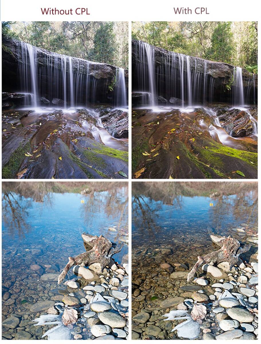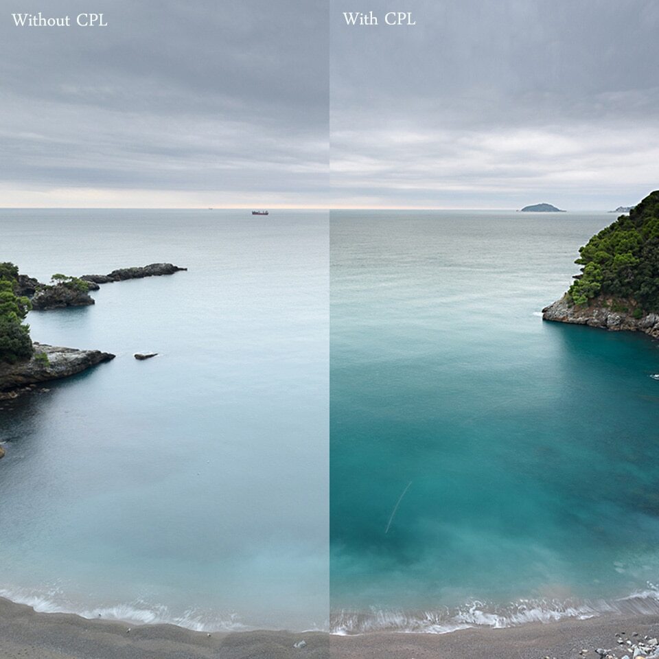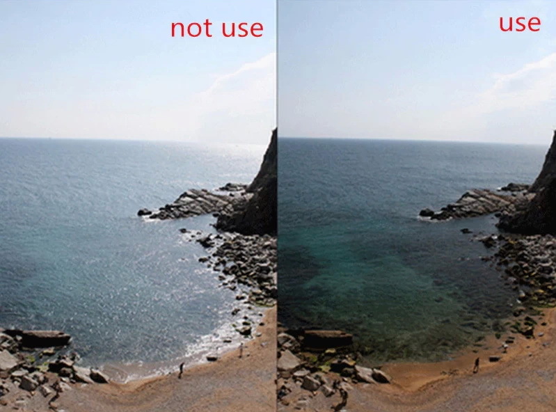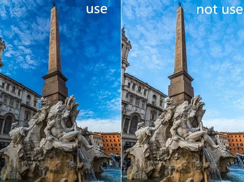 水面やガラスなどの光の表面反射を除去する効果や、青空の色を濃くし、樹葉、山肌、建物などの色彩を非常に鮮やかにする効果が得られます。