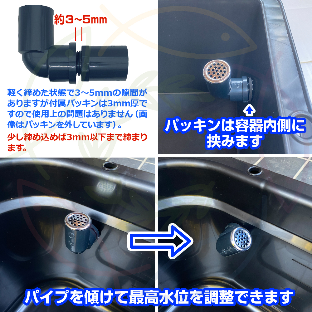 ※オーバーフロー部品は容器内側にパッキンを挟んで手で絞めて取り付けてください。