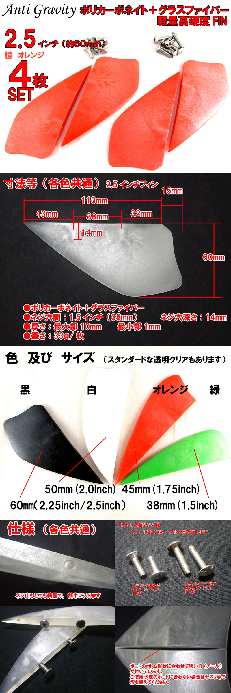 ●Anti Gravityより色付きのカラフルフィン新登場!ボードに合わせた色使いや他人のボードと区別する為、または高さによって色を区別するなど、色んな使い道があります。 チームや仲間で同じ色のフィンを使っても面白いですよね! ●カイトボーディング用ボードの2.5インチ(実測60mm 2.38インチ)フィンです。ネジピッチさえ合えば色んなメーカーのボードに取り付け可能ですので、ダメージを受けてガリガリになってしまったり壊れてしまったフィンの修理に。 お手ごろな価格設定ですので、色んな高さのフィンをお試しください!たかがフィンですがされどフィン。乗り心地が変わりますので、乗り方や水面の状況に合うフィンを探す事ができると思います。 ●素材はポリカーボネート+グラスファイバーです。戦闘機のキャノピーなどにも使われる素材ですので、高強度で軽量です。一般的なG10素材よりも25%ほど軽く作る事ができます。 また、色は塗装ではなく素材に練りこんでありますので、表面が剥がれて中の色が出てくるようなこともありません。 ●一般的なG10素材のフィンのネジ穴は成型後ドリルで開けるためこの部分がウイークポイントとなり、割れたり抜けたりする事があります。こちらのPC+FG素材はねじ山を成型時に作り、複合素材を高圧力のプレスで成型している為、ネジがすんなりと入り、また強度も十分確保されています。 ●有名ブランドではありませんので値段が安いですが、作りはそこそこしっかりしています。自分でも1年以上使用していますが特に問題ありません。 基本的に大きな(高い)フィンを使えばアップウインド性能が上がり、エッジを効かせやすくなります。逆にクイックになりすぎて扱いづらい時や、フラットな水面の場合は大きなフィンは必要ありません。(個人的な考えですので間違っていたらすみません) ●寸法等:全長128mm(ボード接触面113mm) 高さ60mm(2.5インチ) ネジ穴間38mm(1.5インチ) フィン1枚につき ステンレス製 皿ネジM5x15mm x2 ナベネジM5x20mm x2 付属 |