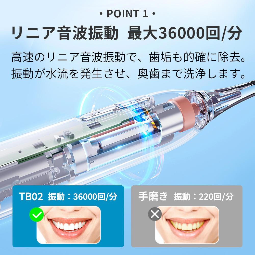 | 商品説明 | ・・【 進化し続けるデンタルケア技術 リニア音波振動式電動歯ブラシ 】 ・36,000回/分のリニア音波振動で手磨きでは実現できない歯垢除去力を実現。歯に軽く当てるだけのプロ級の口腔ケアは今までの歯磨きを”ブラッシュアップ”。 ・【 ニーズに応える5つのモード 弱・中・強の3段階パワー調整 】 ・・ クリーンモード 歯垢や表面汚れを効果的に除去する ・・ ソフトモード 歯ぐきや歯肉にやさしい振動でブラッシング ・・ ホワイトモード 強力な洗浄力で歯の色調改善をサポート ・・ ポリッシュモード 縦横方向の小刻み振動で、歯の表面を研磨 ・・ マッサージモード 立体振動で血行を促進し、歯周病の予防に ・全てのモードで弱・中・強の三段階のパワーを調整でき、子供やお年寄りなど歯ぐきが弱い方や力強いブラッシングが好きな方まで、幅広い方々が選択可能に。 ・【 歯にフィットする高密度ブラシ 約1年間使える3本のブラシヘッドを付属 】 ・耐久性と柔軟性に優れた米国デュポン社のブラシ毛を採用。ボール状の毛先加工はエナメル質と歯ぐきを傷つけず、優しくマッサージしながら歯垢をしっかり取り除く。 ・【 90日間の連続稼働パワー 、2分間のブラッシングタイマー 】 ・一回のフル充電で約90日間(ソフトモードで1日2回使用)の連続使用を可能にし、2分間作動中に30秒ごとに0.3秒一時停止してブラッシングの区切りをお知らせ。 ・【 スタンド不要なUSB-C 直充電、 IPX7安心の防水性能 】 ・無駄を省いたUSB-C直接充電方式を採用し、歯ブラシの置き場や持ち運びに優れた収納性を実現。歯ブラシ本体はIPX7防水等級で、丸ごと水洗いや入浴中の使用も可能。 |