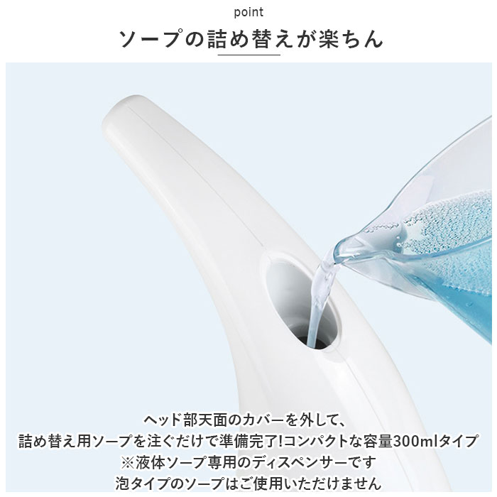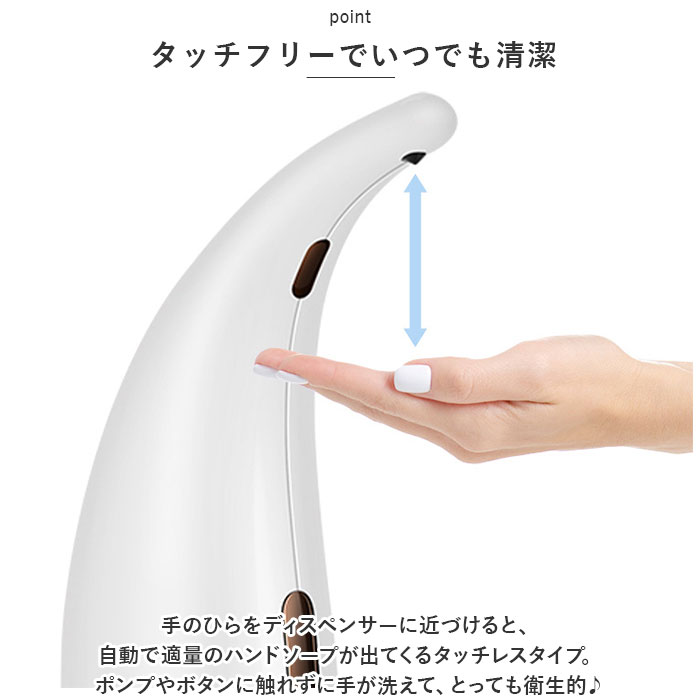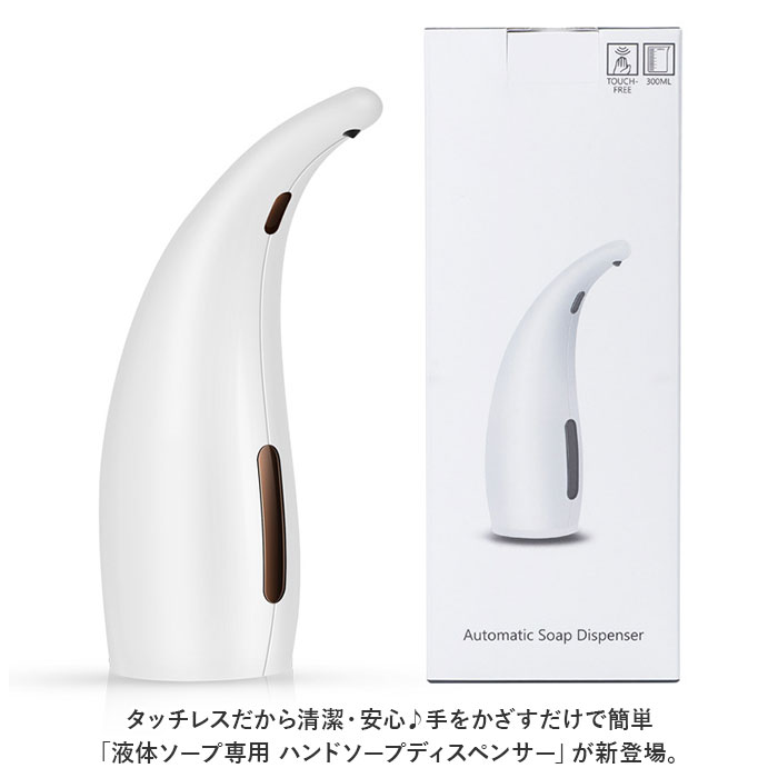 | 商品説明 | ・・タッチレスだから清潔・安心♪手をかざすだけで簡単「液体ソープ専用 ハンドソープディスペンサー」が新登場。 ・【タッチフリーでいつでも清潔】 ・手のひらをディスペンサーに近づけると、自動で適量のハンドソープが出てくるタッチレスタイプ。ポンプやボタンに触れずに手が洗えて、とっても衛生的♪ ・【必要な量が手に取れて経済的】 ・ヘッド部のセンサーに手をかざすとランプが青色に点灯し、ハンドウォッシュ1回分(約1ml)のソープ、さらに2秒待てば追加のソープが手に取れる仕組み。 ・【手軽に置けるコードレス】 ・配線のわずらわしさのないコードレス・電池式タイプ!洗面化粧台やキッチンなど、こまめに手が洗いたい場所に手軽に置けるのが嬉しい♪ ・【電源ONで、すぐに使える】 ・底部のカバーを回転させて、単4型乾電池を4本入れるだけで電池交換も簡単。カバー横の電源ボタンをONにすれば、すぐに使えて便利!(※電池は別売りです。) ・【ソープの詰め替えが楽ちん】 ・ヘッド部天面のカバーを外して、詰め替え用ソープを注ぐだけで準備完了!コンパクトな容量300mlタイプ。(※液体ソープ専用のディスペンサーです。泡タイプのソープはご使用いただけません。) ・【残量が見やすいクリア窓付き】 ・ハンドソープの残量がひと目で分かるクリアウィンドウ付きなので、詰め替え用ソープの買い足し時期も迷わない! ・【水回りに調和するデザイン】 ・木目調や大理石調、メタリック調まで、水回りのインテリアにフィットするテクスチャ&カラーをラインナップ。風邪やインフルエンザの流行が気になる季節に大活躍! |