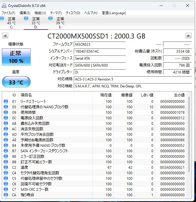 【SATA600・2TB・786回・4216時間】 Crucial CT2000MX500SSD1 MX500 2TB 3D NAND SATA 2.5-inch 7mm