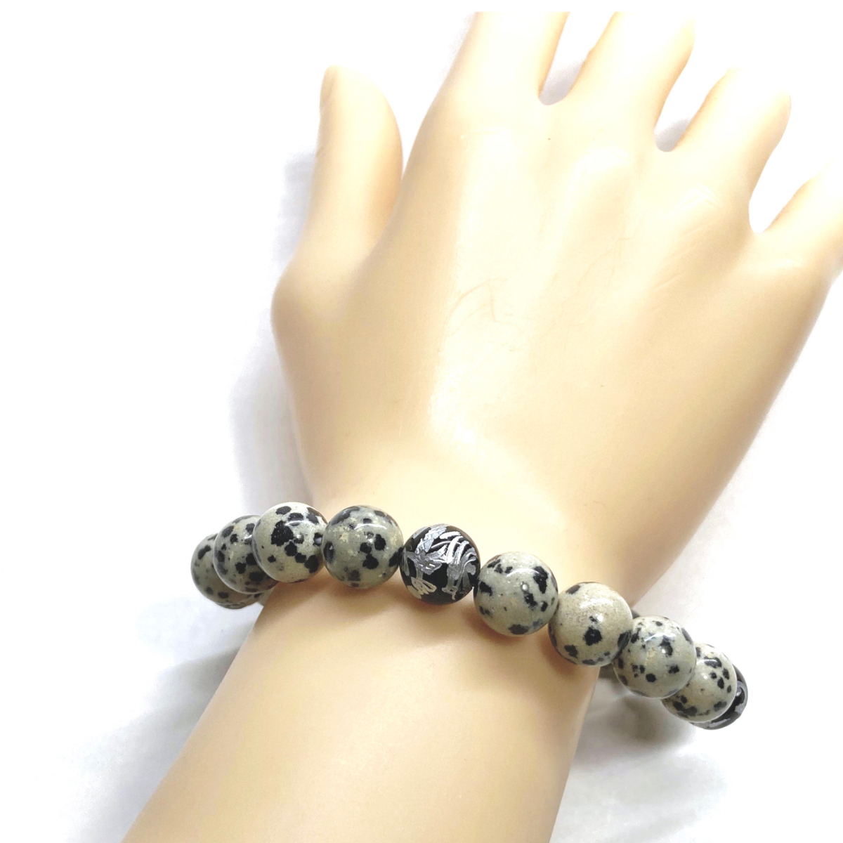 こちらは、四神獣銀彫オニキスとダルメシアンジャスパーを組み合わせたパワーストーンブレスレットです。四神獣は、中国の伝説で4つの方向(東西南北)を守護する神聖な神。四神獣、厄災から身を守り、多くの運気を呼び込むと言われております。石大きさは程よくインパクトのある10mm玉で内周 約17cmです。 数に限りがございますので気になる方はお早めにどうぞ。