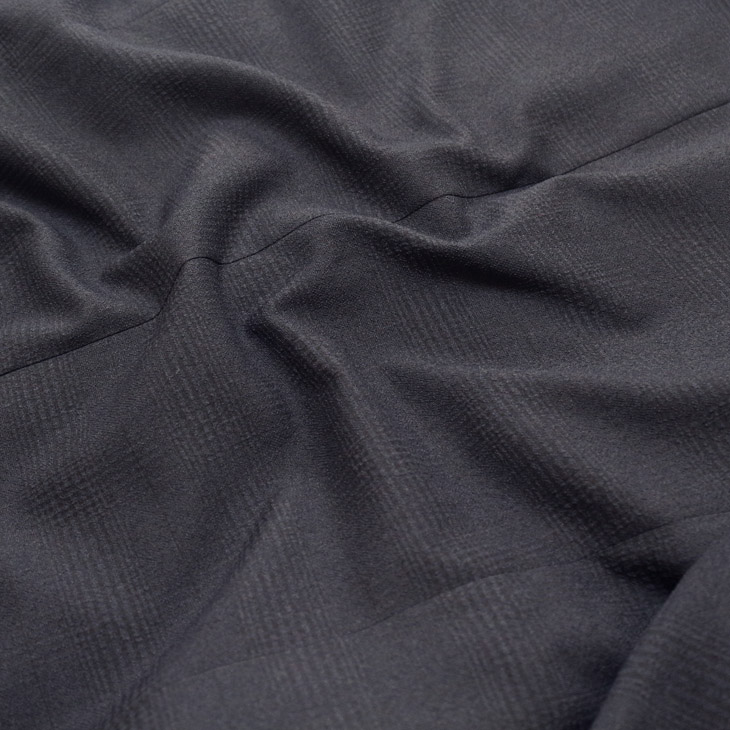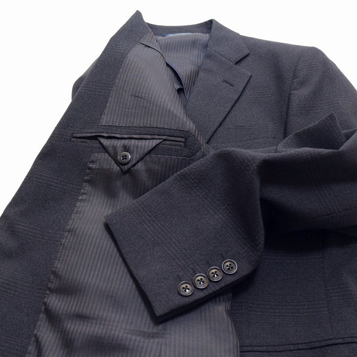背裏は観音開きの背抜きパイピング補強仕立、切り台場、 袖口4つボタンX止め、袖口裏額縁仕上、股ズレ防止のシック付き |