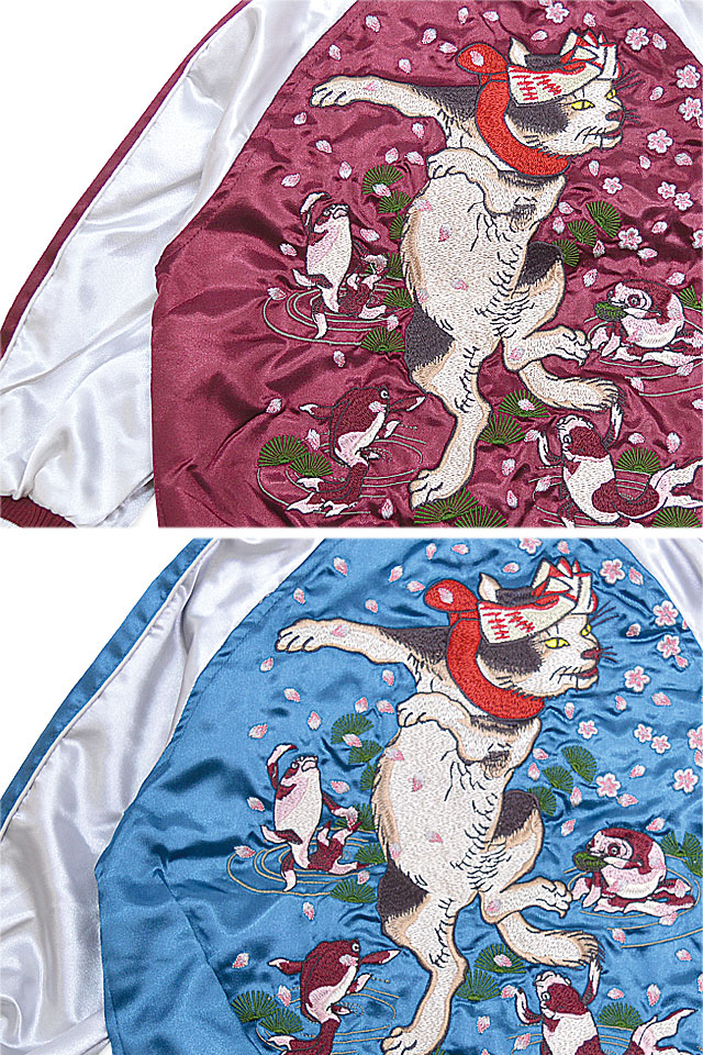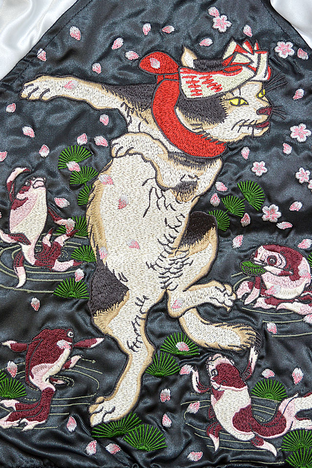 刺繍に定評のある古舗ブランド、華鳥風月の姉妹ブランド「朧」から「猫スカジャン/キッズ(9041894)」のご紹介です! 待望のキッズスカジャンが登場!! カジュアルなポリエステル生地を使用し、気軽にお楽しみ頂くことの出来るスカジャンを製作しました。 今回、モチーフの主役に採用されたのは【猫】柄。 | ||||||