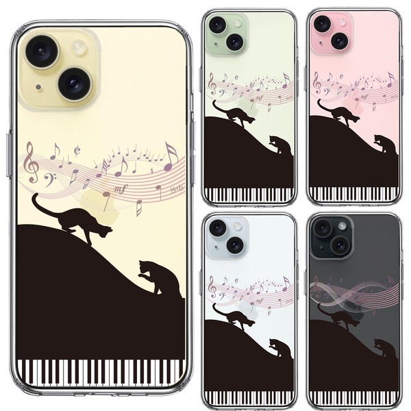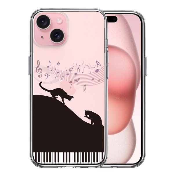 iPhone15 ケース クリア ピアノ シルエット猫 ブラック スマホケース 側面ソフト 背面ハード ハイブリッド