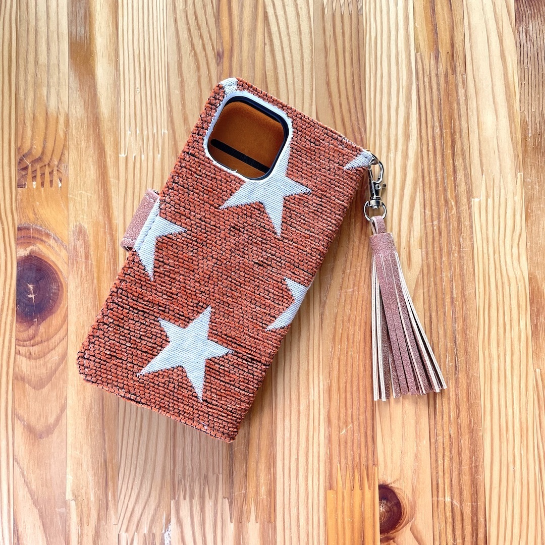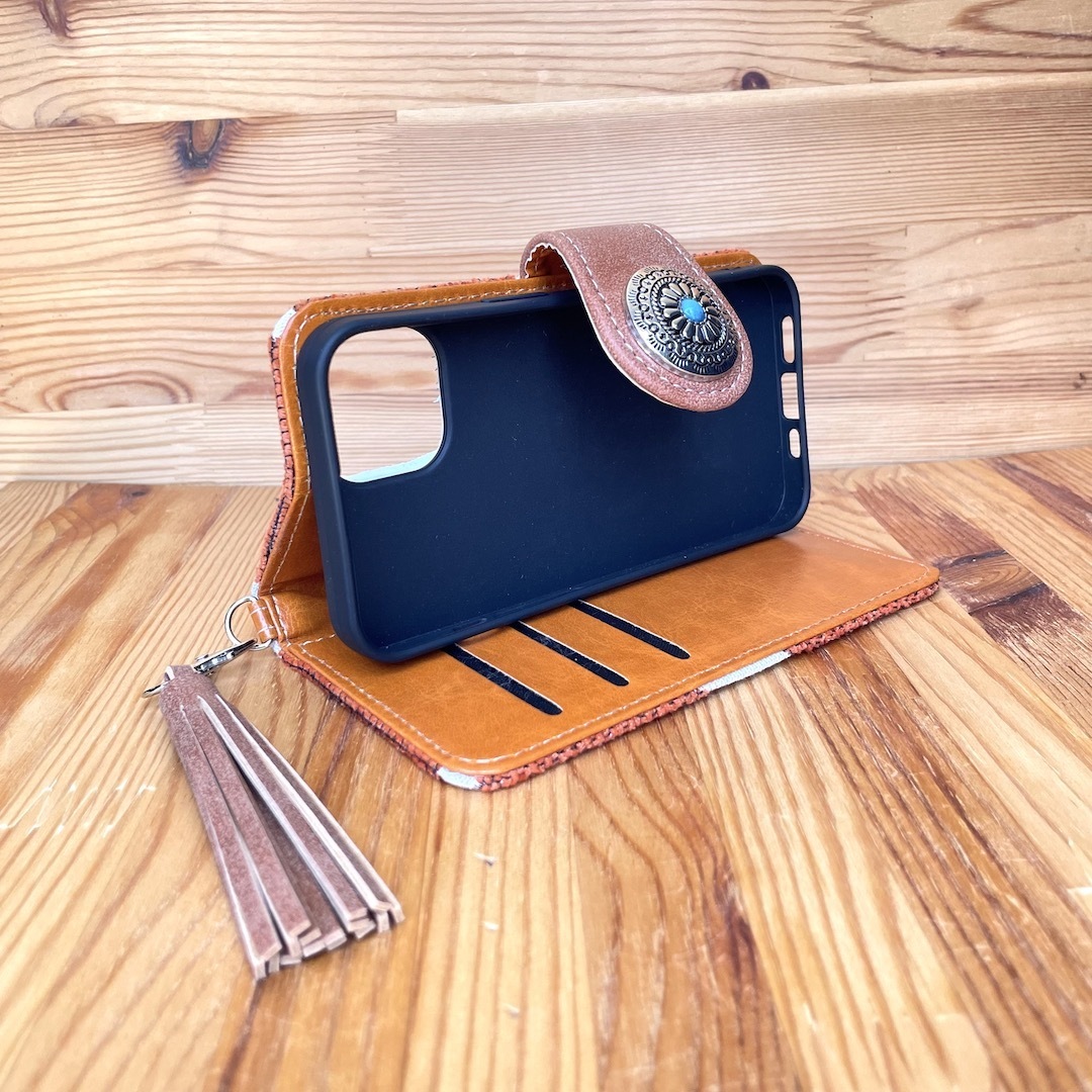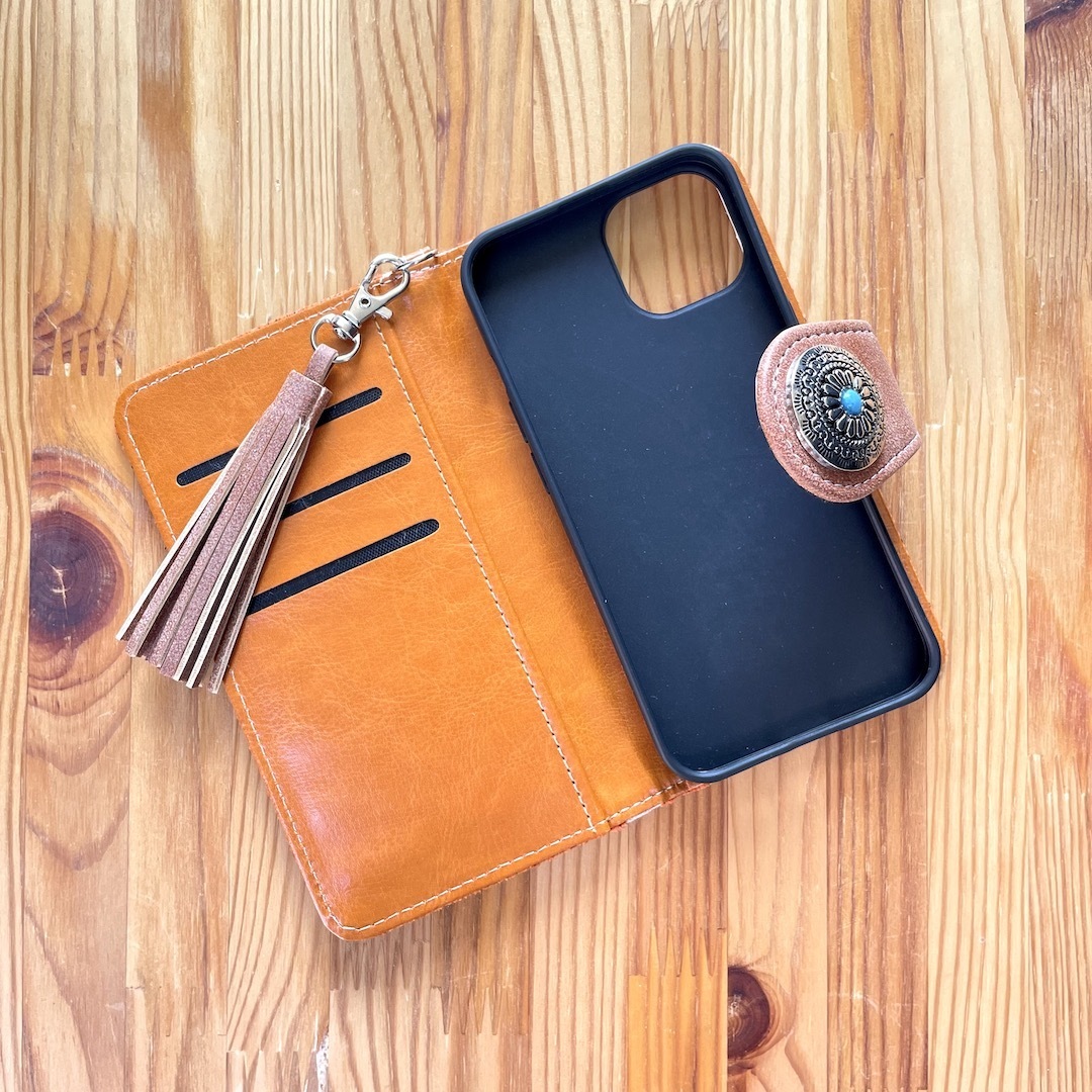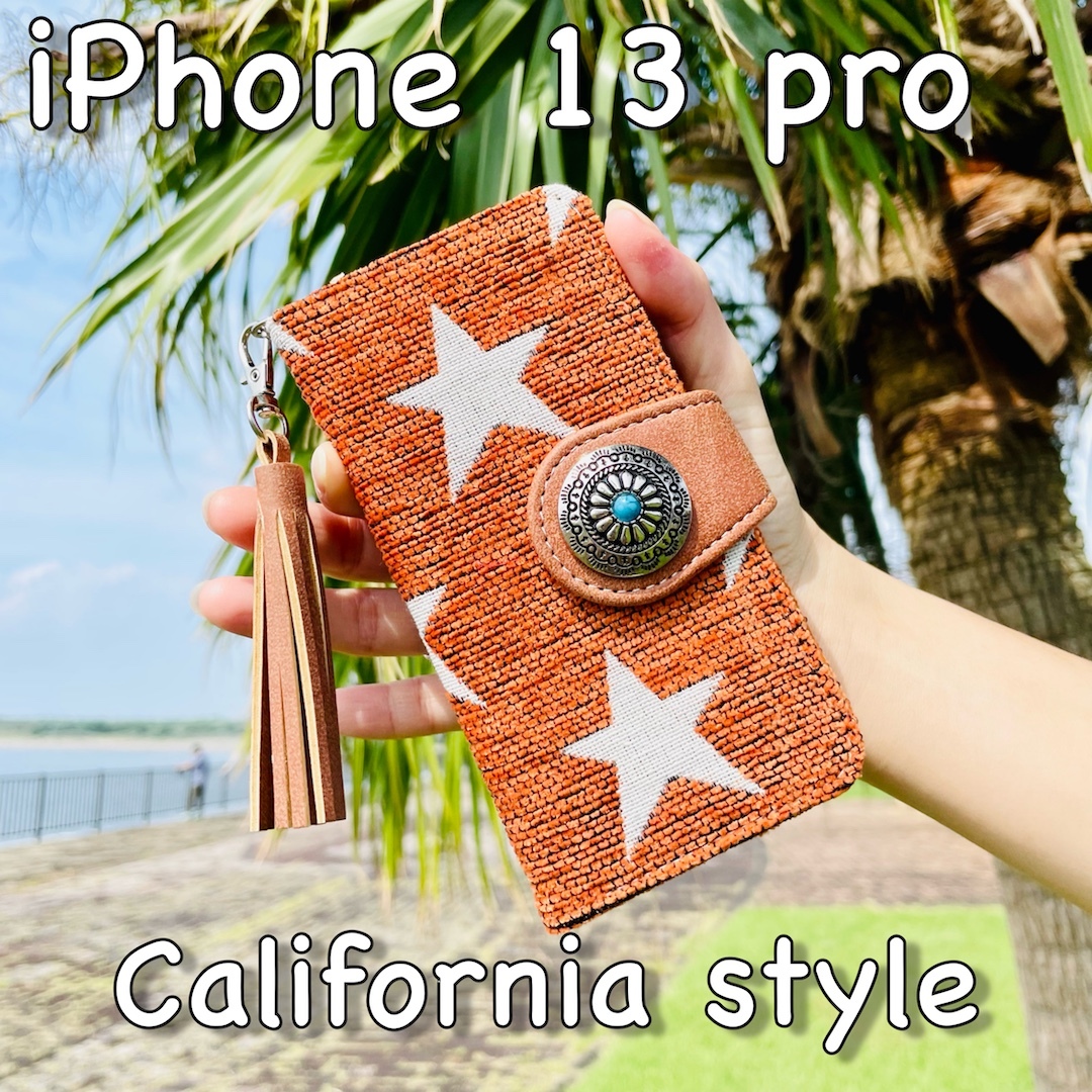 iPhone 13 pro レザーケース☆西海岸スタイル 星柄&コンチョ☆アイフォン手帳型カバー