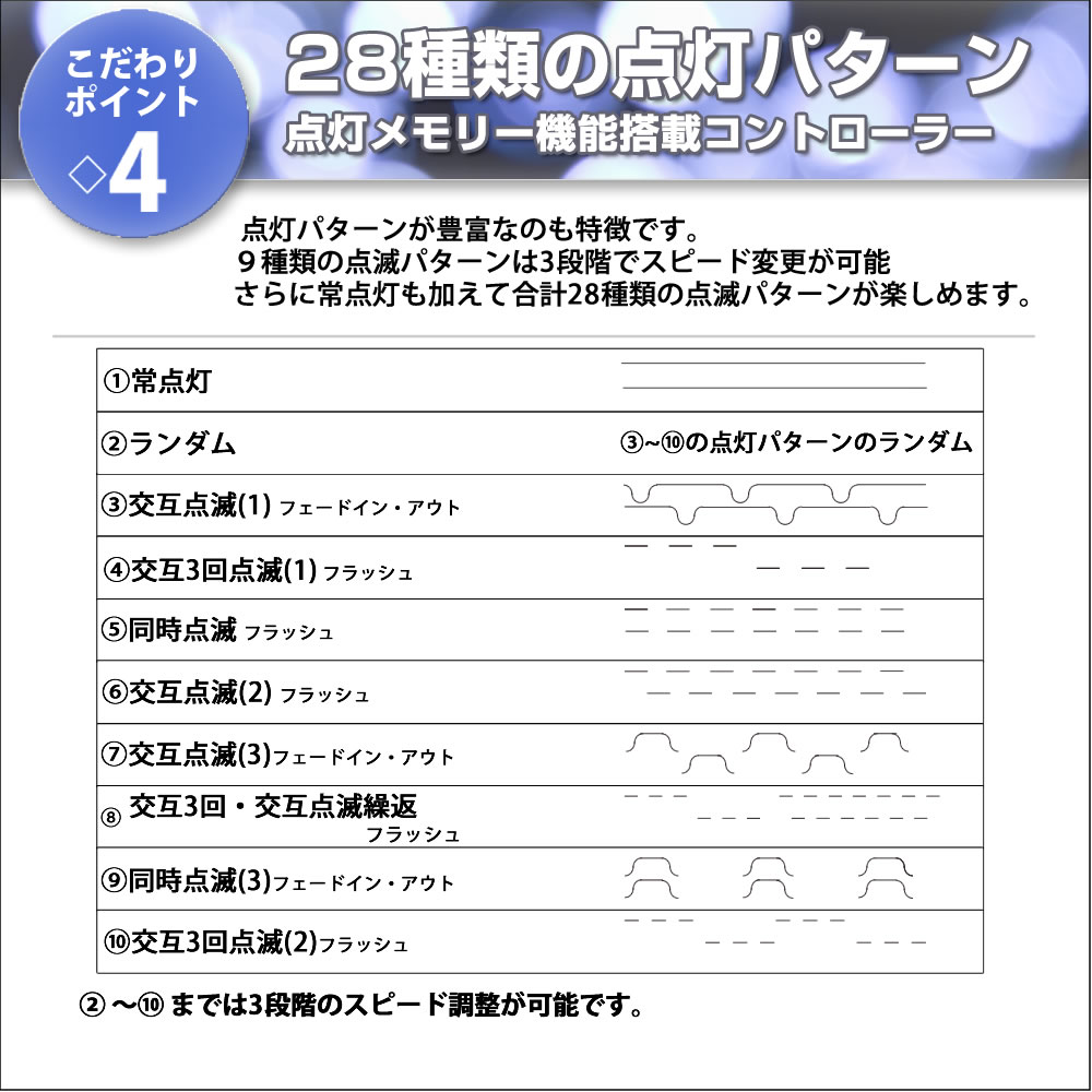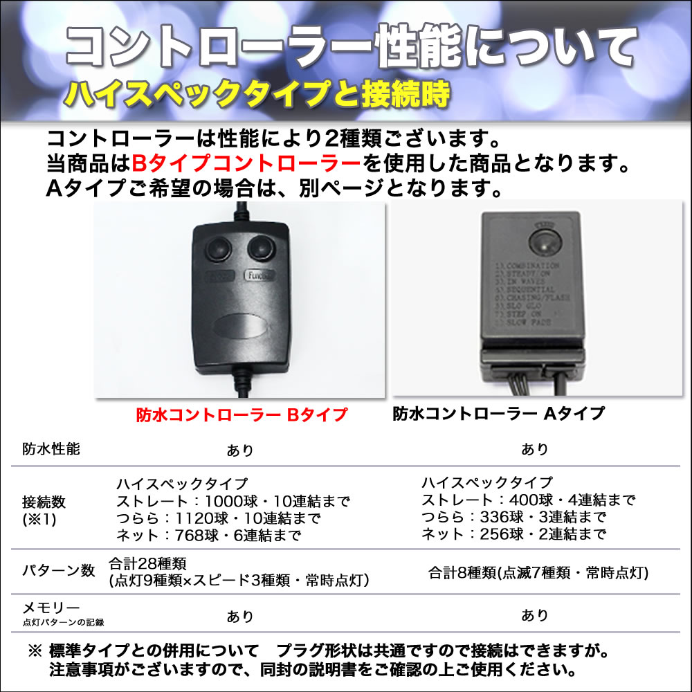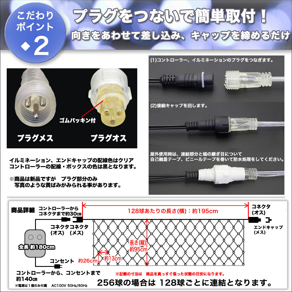| 640球(128球×5組) シャンパンゴールド・電球色 点滅28種類 Bタイプコントローラー付セット ![]() 最近は、LEDイルミネーションも各社が販売しており、 会社はもちろん、自宅等にもイルミネーションを飾り付けするケースも増えてきました。 イルミネーションで、木、庭、クリスマスツリー 等をライトアップでき、明るく印象を変える事ができます。 最近は、価格安いイルミネーションも増えていますが、 品質面に不安を感じた事はありませんか? 「防水性能がしっかりしておらず壊れた…」 「コントローラーの作りが簡素で不安」 等々で、失敗されたお客様、 品質にこだわったイルミネーションを使ってみませんか? 当社のイルミネーションは、購入してから 安心してお使い頂く為に、 とにかく品質面にこだわった商品です。 こだわりのポイントをご紹介いたします。 ![]() ![]() ![]() ![]() ![]() ![]()