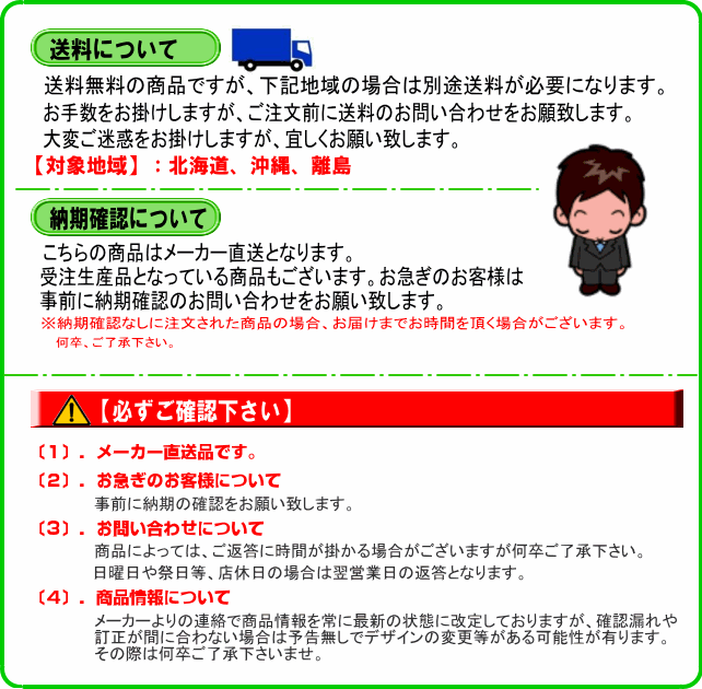 | 【納期確認について】 当商品はメーカー直送品となります。 必ず、事前に納期確認のお問い合わせをお願い致します。 |