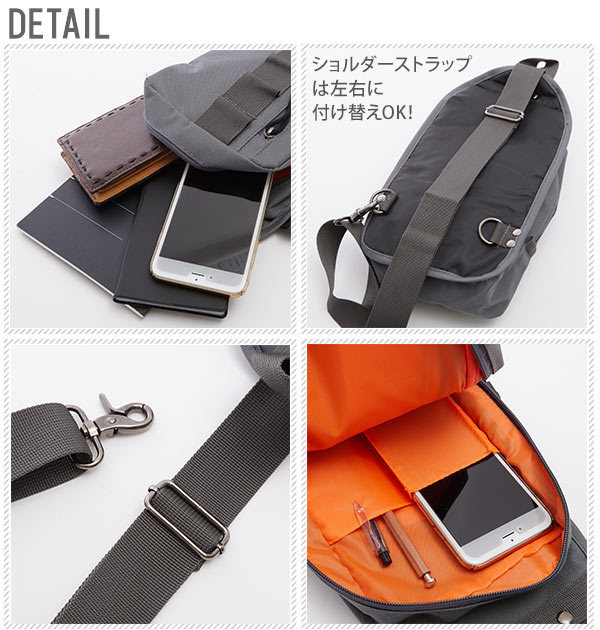 | 商品説明 | 軽量でいて、アウトドアライクな印象を感じさせるデザインのシンプルボディバッグ♪メインルームはダブルファスナー使用で、手帳サイズの荷物はタテにすっぽり収納OK!サブルームも大きく開くジップポケット式なので、スマホ・財布など、すぐ取り出したい荷物の収納に便利です。本体前面のMOLLEシステム風のディテール、ライニングがオレンジなのがポイント♪ |