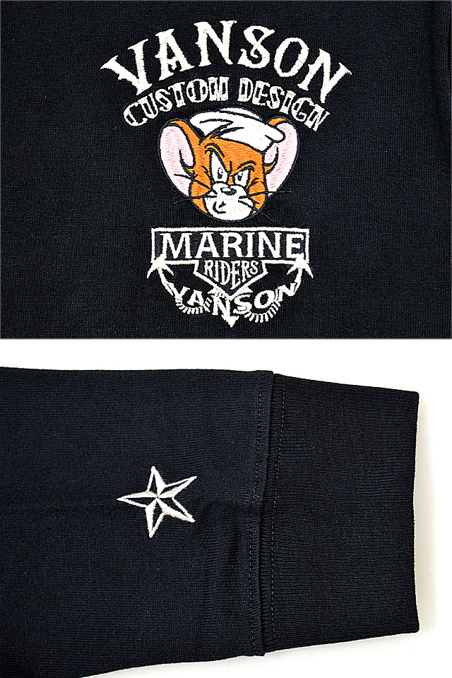 上質なレザーを使って生み出された数々のアイテムがバイカーに大人気のvansonから「vanson×TOM&JERRYコラボ ベア天竺ロングTシャツ(TJV-2332)」のご紹介です。 体が大きく凶暴だが、おっちょこちょいでどこか憎めない部分のある猫のトムと、体は小さいが頭脳明晰で、追い掛けてくるトムをことも無げにさらりとかわすネズミのジェリーのドタバタを、ナンセンスとユーモアたっぷりに描いたアニメ作品をモチーフにしました。 背中にはモップで掃除をするジェリーが刺繍で描かれています。 マリンテイスト溢れるデザインで、夏にぴったりの1枚です。 バックにしっかり柄を入れている分、フロントはシンプルに仕上げ、メリハリを付けました。 右袖にはブランドロゴをライン状にプリントしています。 ボディーには、ベア天竺という生地を採用。 | |||||||||||||||||||||||||