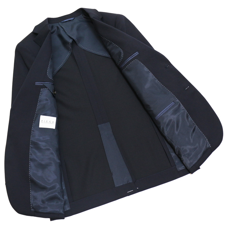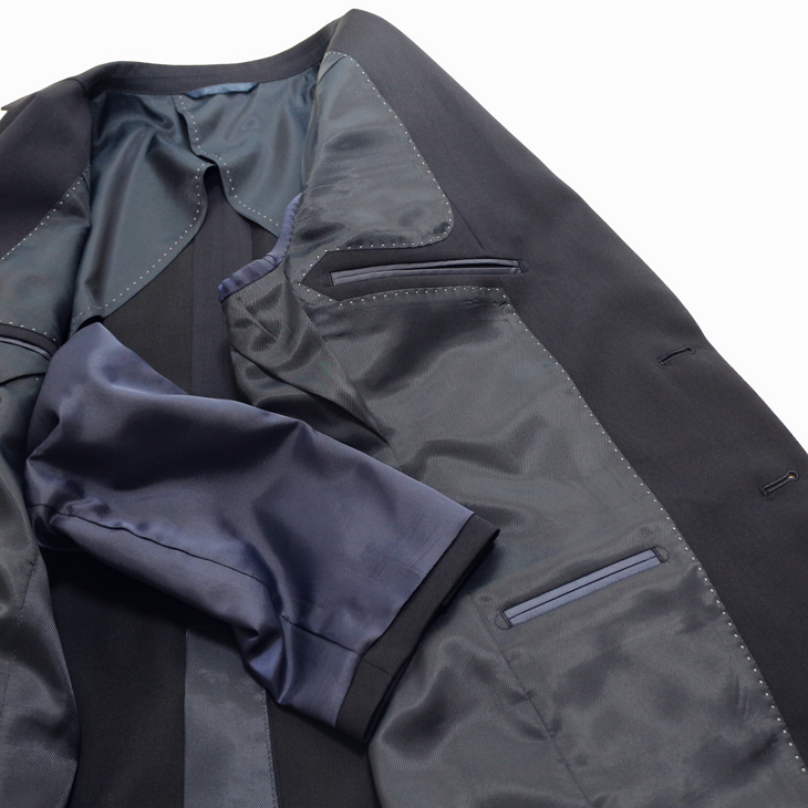 ラペルAMFステッチ(無し)背抜き仕立て・薄肩パット入り・袖口4つボタン 袖口裏額縁仕上・ピンポンステッチ・ボタンX止め・汗止め・チョーシック 生産国:中国製*仕上げプレスは、国内で施しております。 |